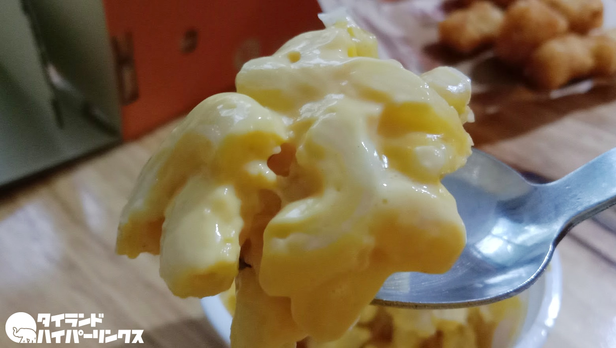 「MAC & CHEESE」(49バーツ)が実に美味しかった! 最近Netflixでアメリカの料理番組をよく見るのですが、頻繁に「マカロニチーズ」と言うのが出てくるんです。それが目の前の「Mac & Cheese」。アメリカ人のソウルフードですね!