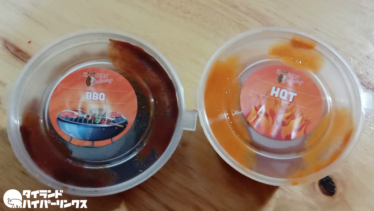 シグネチャーメニューのフライドチキンは2種類をオーダー。「BREADED WING」と「BONELESS WING」が6個づつでそれぞれ199バーツ。ソースはBBQソースとHOTソースをチョイスです。