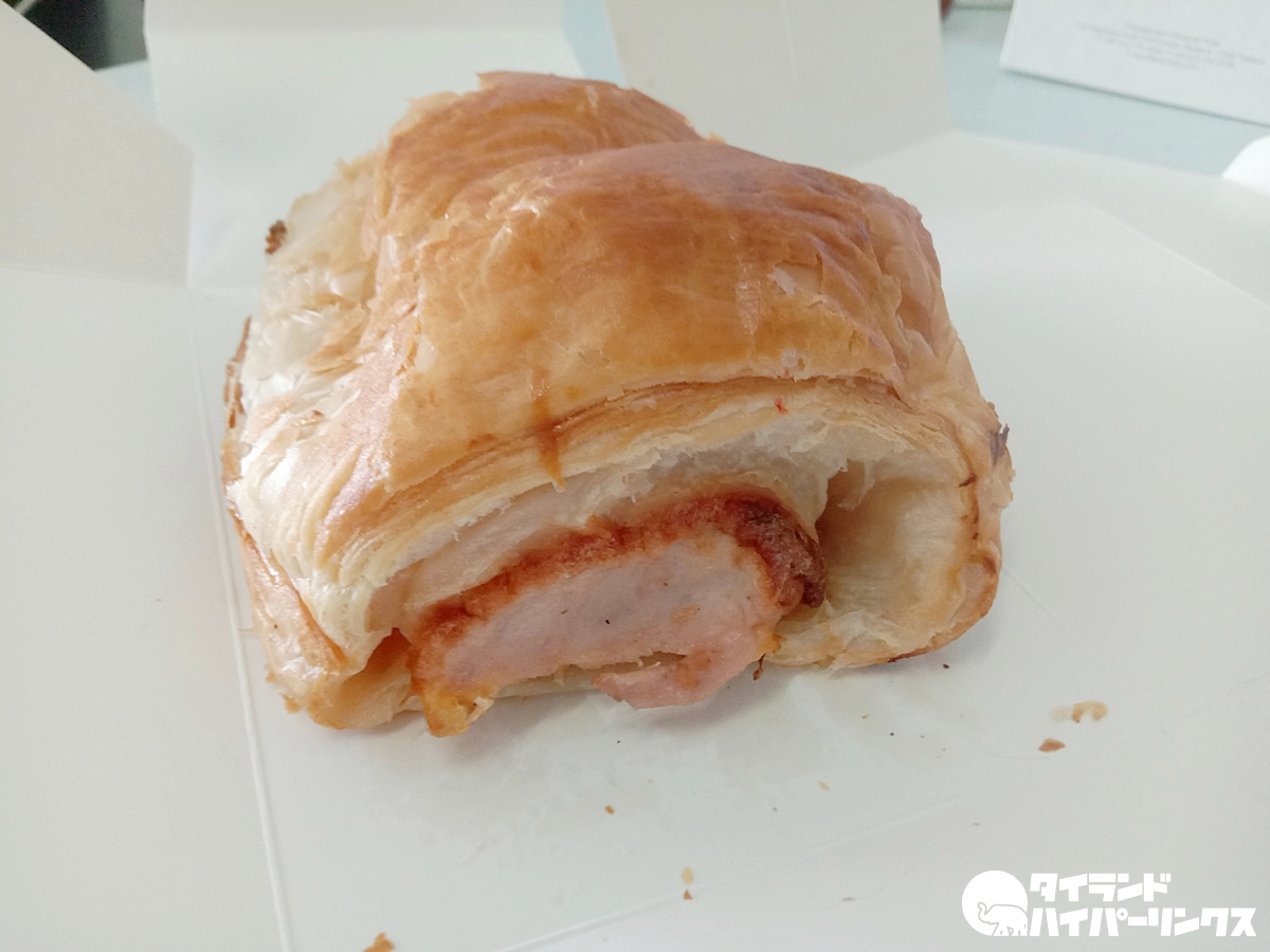 ホテル内のカフェの『モカ&マフィンズ』の看板メニューは「ソーセージ・ロール」(90B)。「これ、ソーセージ?」と迷う巨大な自家製ソーセージが圧巻です。
