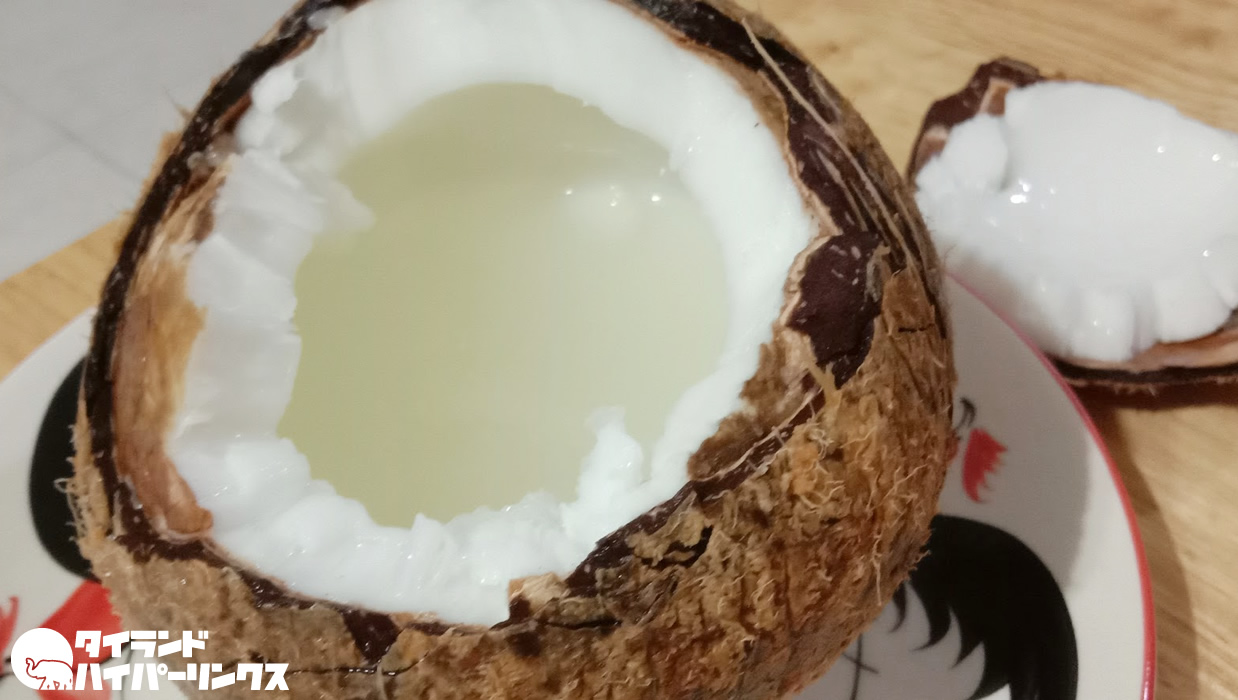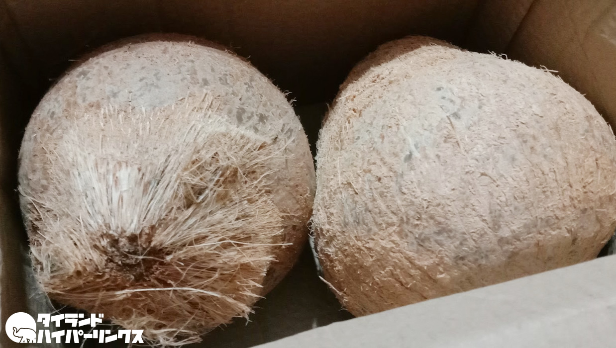 そんな中オンラインで購入したのが、送料込みで2個350バーツというココナッツ「マプラーオ・ガティ(มะพร้าวกะทิ )」。普通のココナッツ丸ごと一個はレストランで注文しても100バーツくらいですから、「マプラーオ・ガティ」はだいぶ高めですね。
