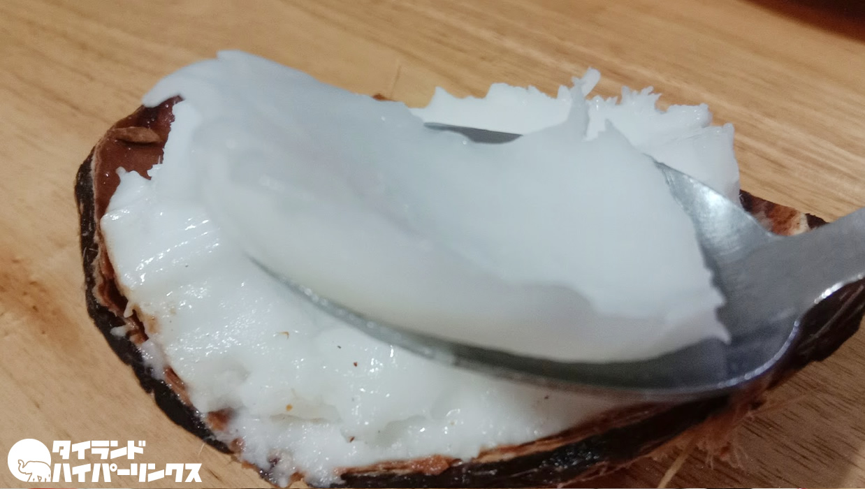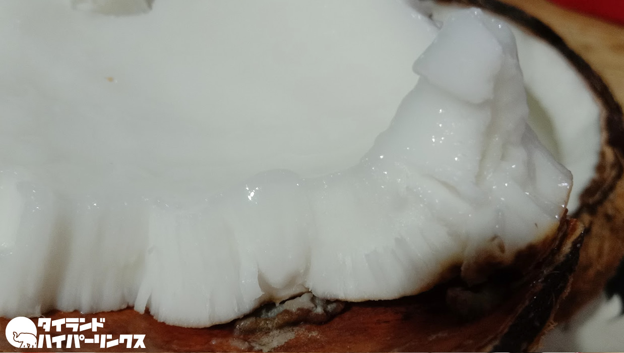 硬い殻を必死で割って、やっと果肉とジュースが見えました。果肉の分厚さ分かりますか?よく見るココナッツの10倍?20倍?「ガティ(กะทิ)」というのはココナッツミルクという意味なのですが、この果肉ならたっぷりココナッツミルクが絞り出せそうです。