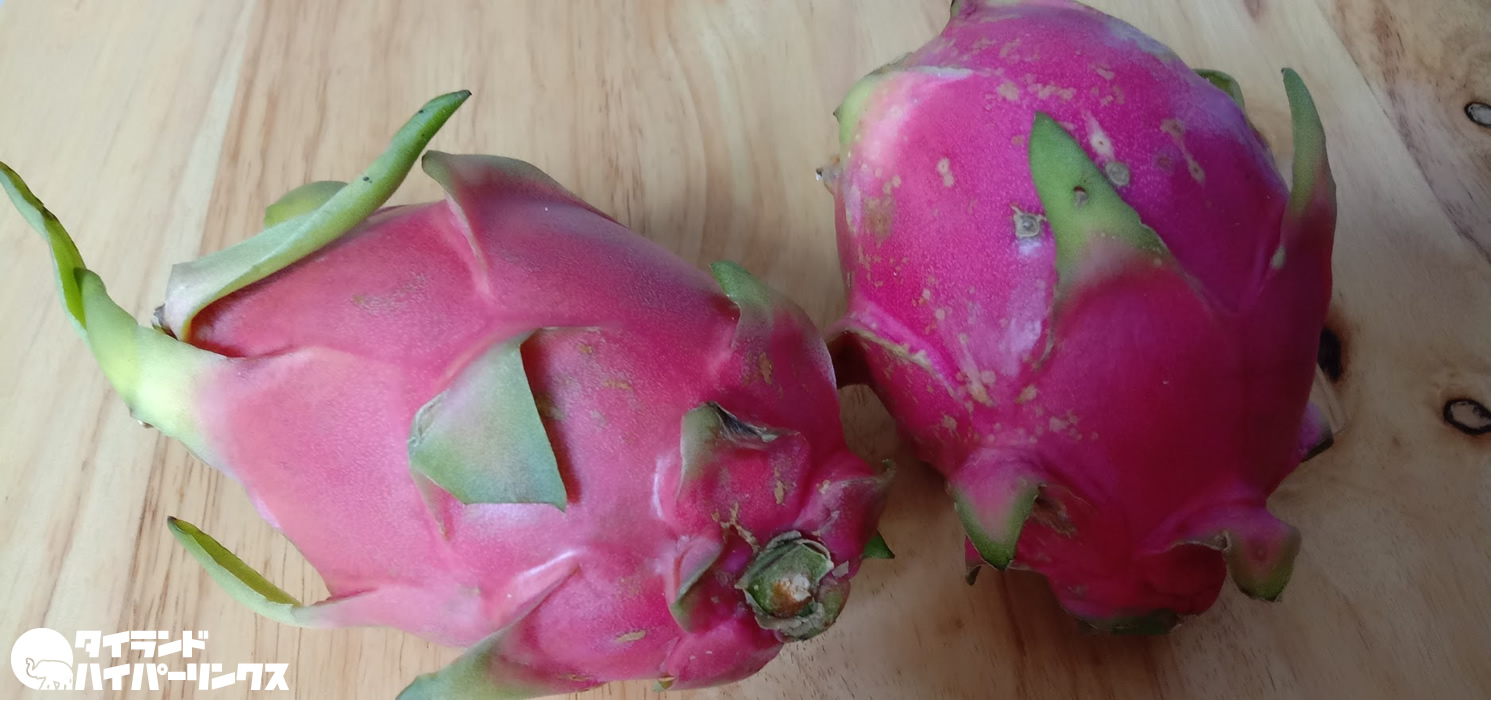 ドラゴンフルーツは、タイ語でแก้วมังกร(ケウマンゴン)。白い果肉と紫の果肉の2種類あって、味はどちらもそんなに変わりませんね。みずみずしくて、ほんのり甘くて、夏にピッタリのフルーツです。実はドラゴンフルーツは、サボテンの実。我が家にもドラゴンフルーツのサボテンがあって、時々実をつけますよ。