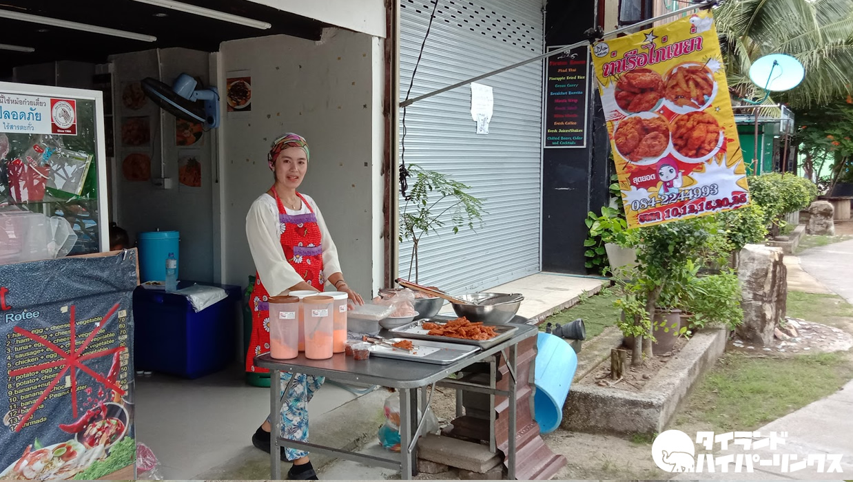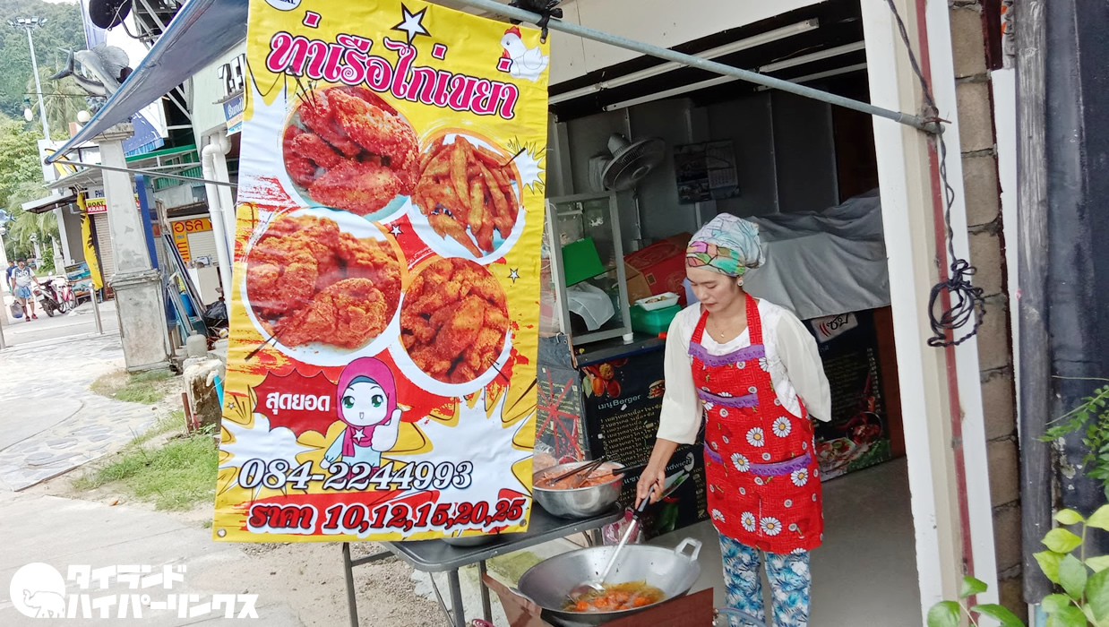 ピピ島を訪れたものの特にやることもなく暇なので、あちこち散歩。そんな時に島の中心であるトンサイ船着場近くで見つけたのが、鶏の唐揚げ屋さん「タールア・ガイカヤオ(ท่าเรือไก่เขย่า)」でした。トンサイ船着場を出て、海沿いの道を右に入り、すぐ左手の場所です。