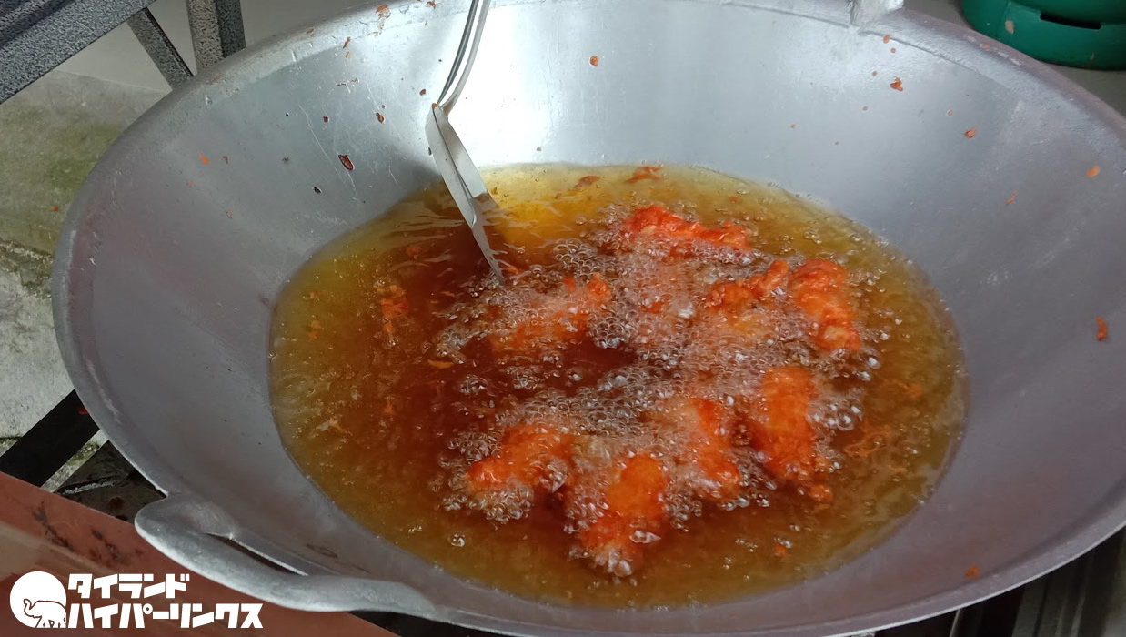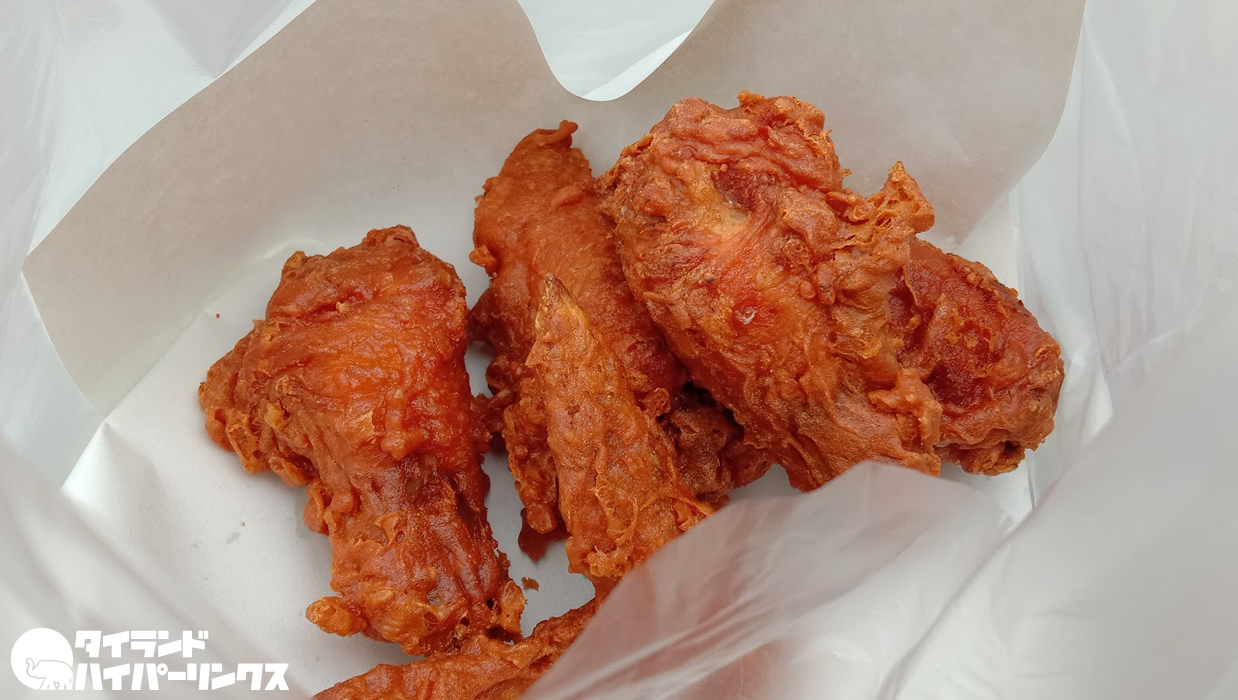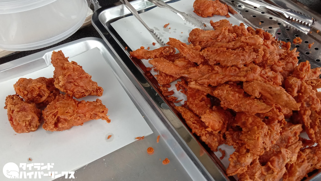 「タールア・ガイカヤオ」 の前を午前中に通りかかった時、ちょうど良い音を立てて唐揚げを揚げているときでした。熱々の出来たて唐揚げを食べる絶好のチャンスということで、一つ12バーツの骨付きの小さいのを4つ購入。