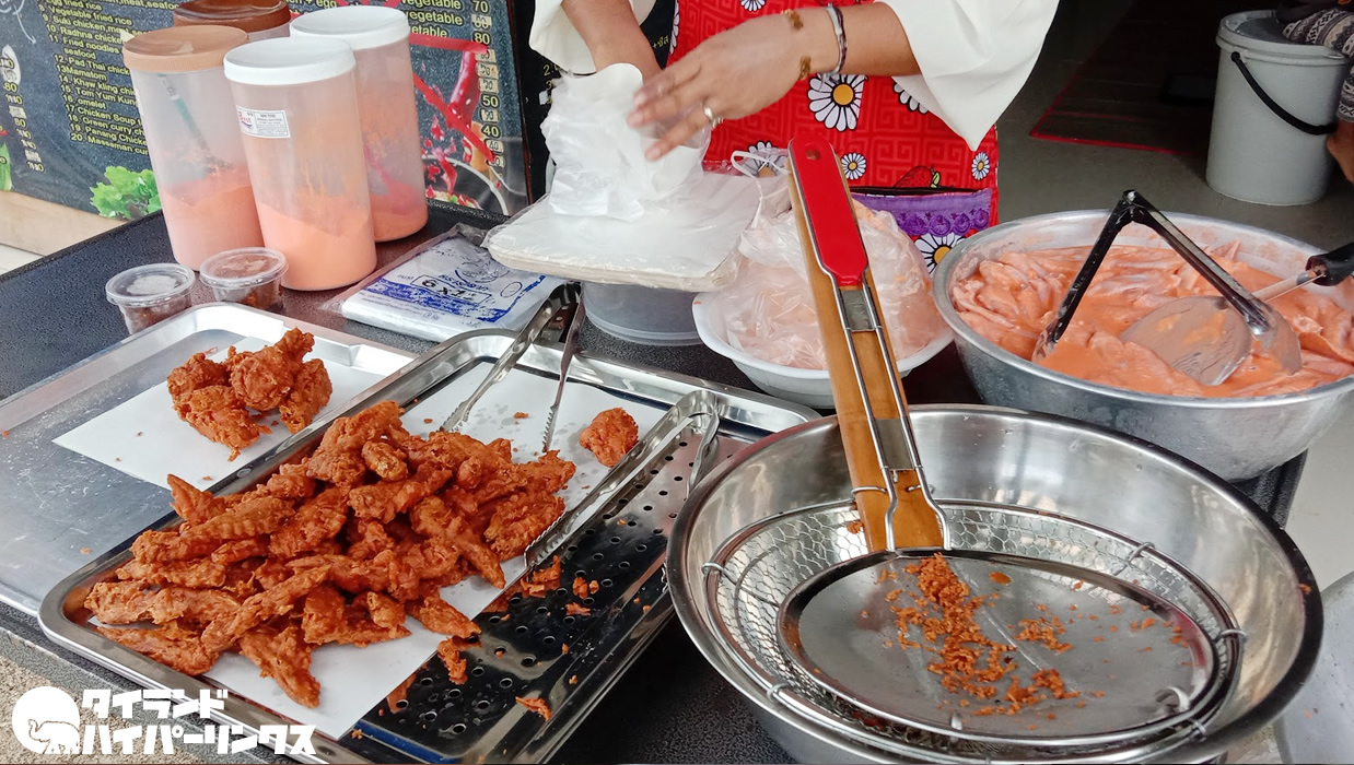 「タールア・ガイカヤオ」のタールアとは船着場(港)の意味。そしてガイカヤオというのは鶏の唐揚げにパウダーで味付けをしたものですね。バンコクのナイトマーケットでも良くみかけますが、チーズ味だったり、トムヤム味だったり、ピリ辛だったりするパウダーを選んで振りかけて、シャカシャカ混ぜてもらうんです。