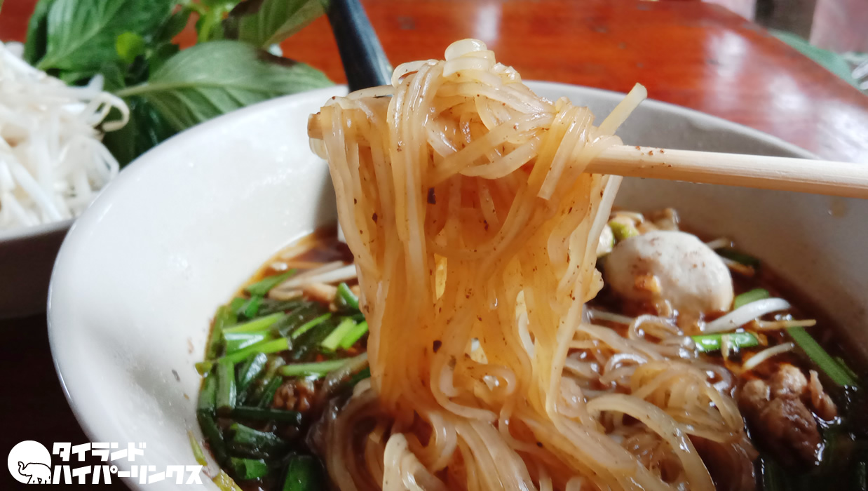 「クワイティアオ・ルア」とは豚の血入りスープの米粉麺(クワイティアオ)のことで、かつて船(ルア)の上で売られていたことから、そう呼ばれるようになったのです。別名「クワイティアオ・ナムトック(ก๋วยเตี๋ยวน้ำตก)」とも呼ばれますね。