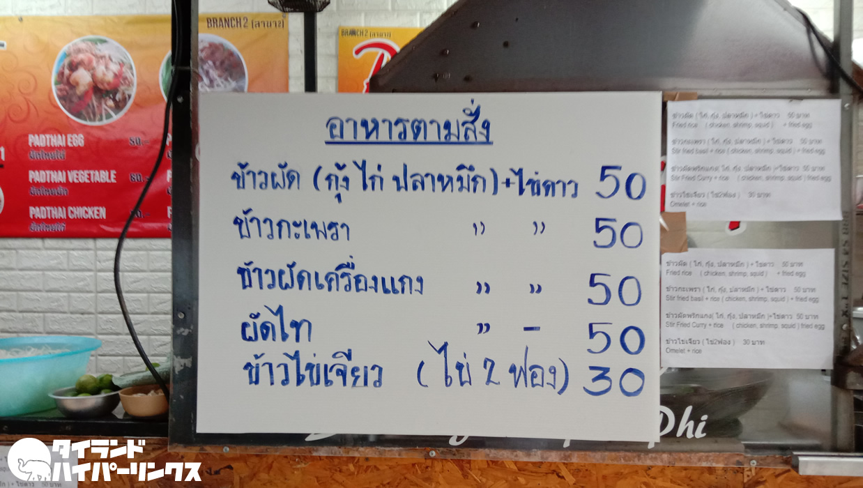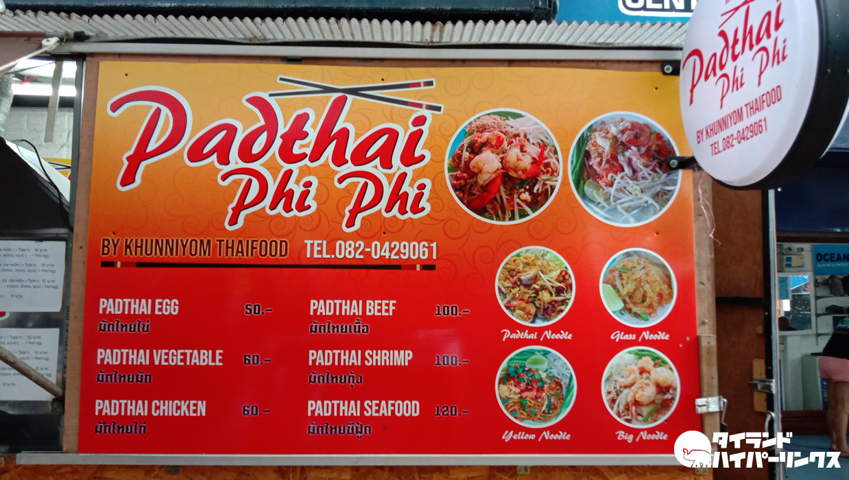 メニューは「Padthai Phi Phi」との店名の通り、タイ式焼きそば・パッタイ(ผัดไทย)がメインのようです。