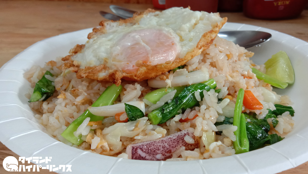しかし今回注文したのは、ひっそりとタイ語メニューにあったイカチャーハン+目玉焼き「カオパッドプラームック+カイダオ(ข้าวผัดปลาหมึก+ไข่ดาว)」です。価格は50バーツ。