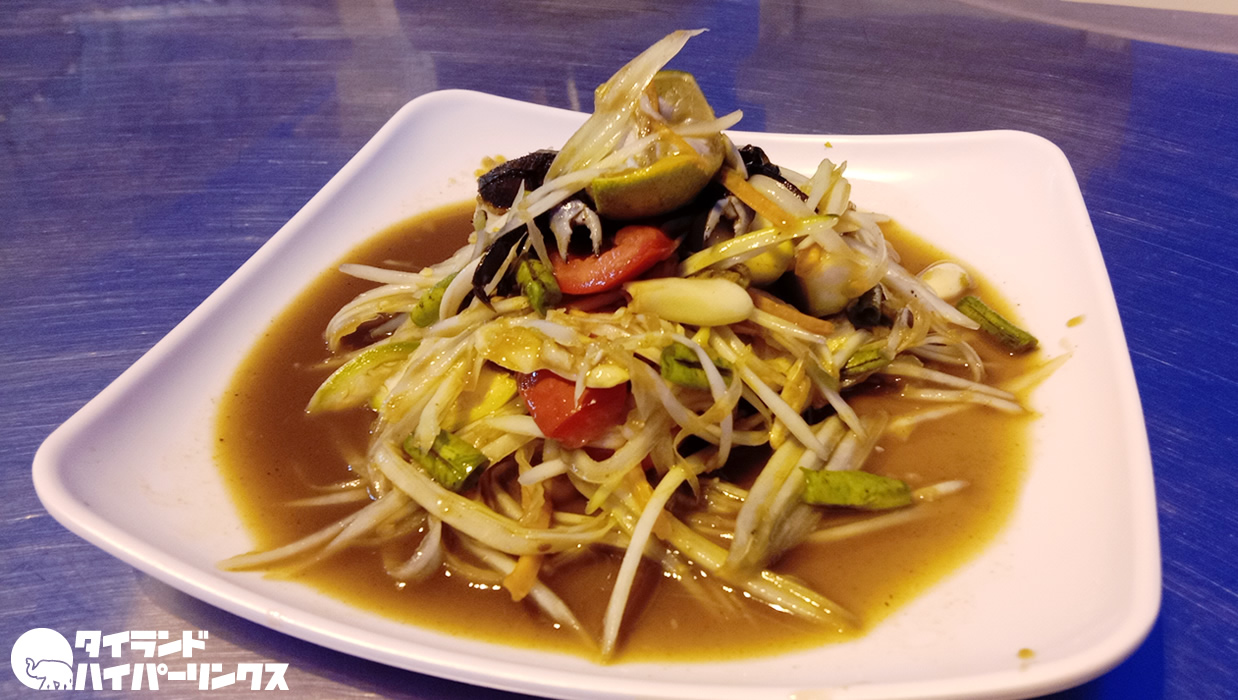 まずはこちらがパパイヤサラダのソムタム。タイ東北風のカニと発酵した魚の汁が入った「ソムタムプーパラー(ส้มตําปูปลาร้า)」を一つ。価格は70バーツ。 これのカニも魚も海のものではないので、シーフードではありませんね(笑)。