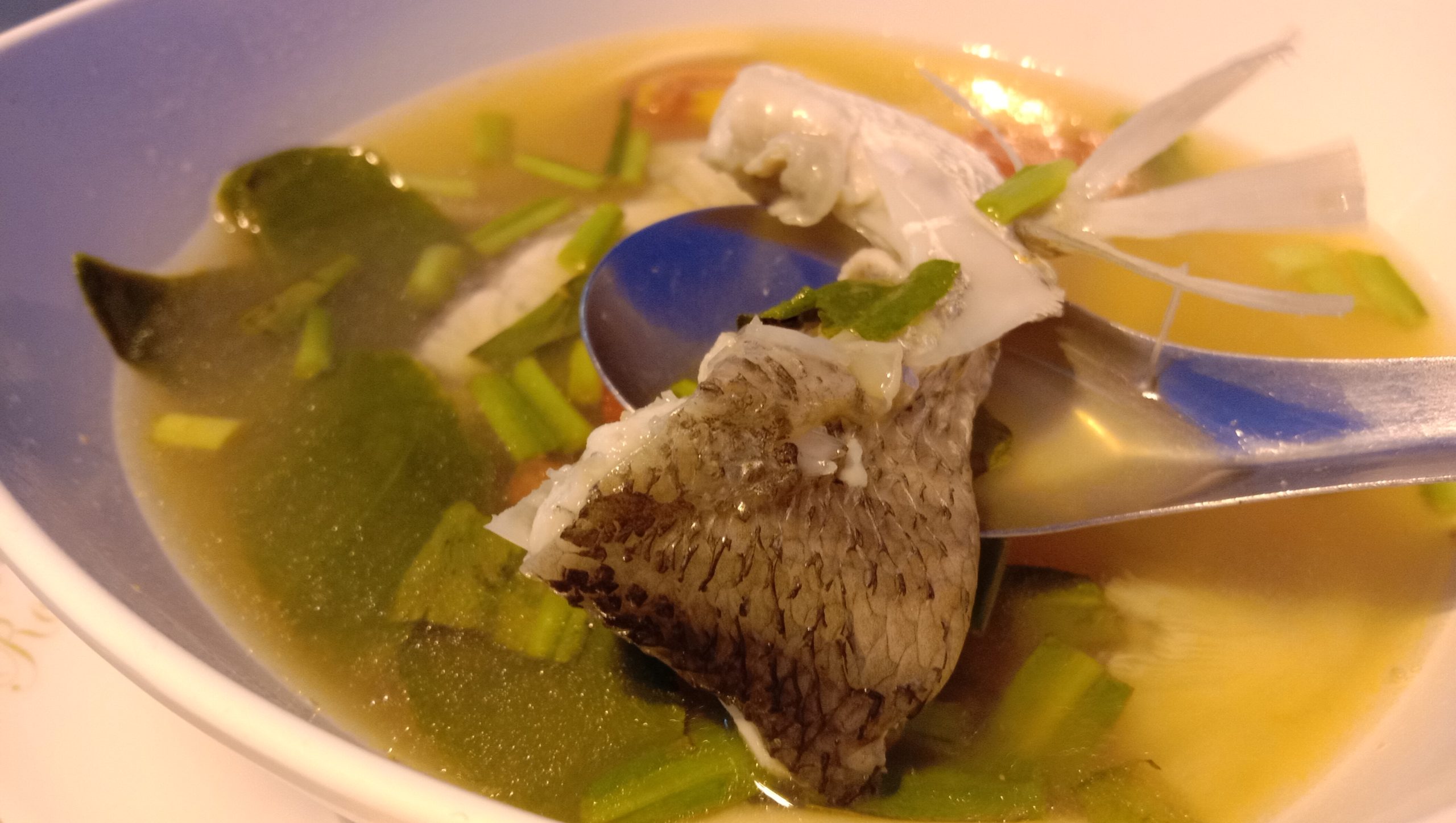 そして辛くて酸っぱいトムヤムスープ。スズキの様な魚が入った「トムヤムプラーガポン(ต้มยำปลากะพง)」です。価格は150バーツ。正真正銘のシーフードです(笑)。