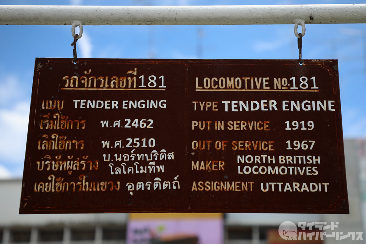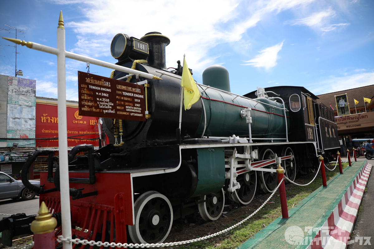置かれているのは、ノース・ブリティッシュ・ロコモティブ社(North British Locomotive Company)製造の蒸気機関車。1919年から1967年まで実際にタイ国内を走っていたものだそうです。