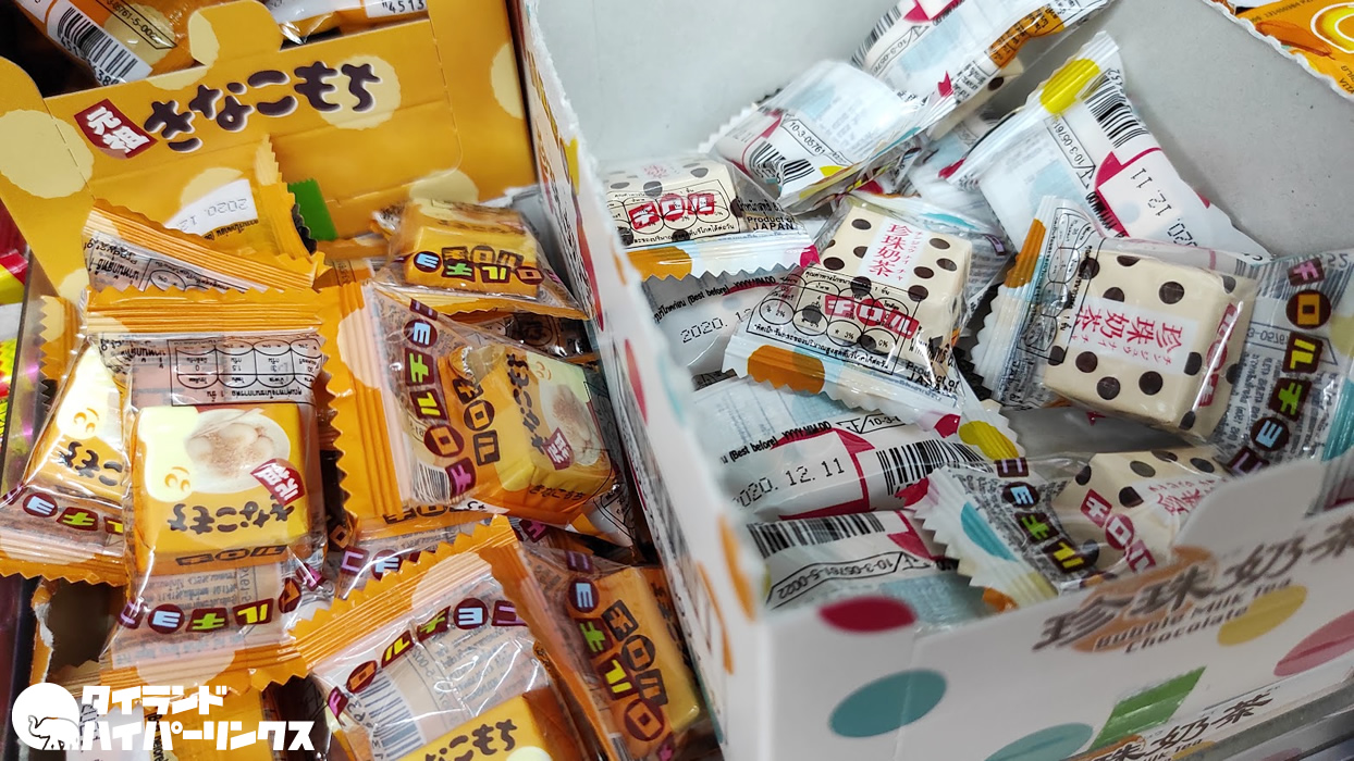 販売されていたのは、「元祖きなこもち」と「珍珠奶茶(タピオカミルクティ)」。価格は一つ7バーツ(約24円)。日本では一個20円だとかで、輸入品なのに、しかも更にビニールのパッケージ入りなのに、高くないんですね。