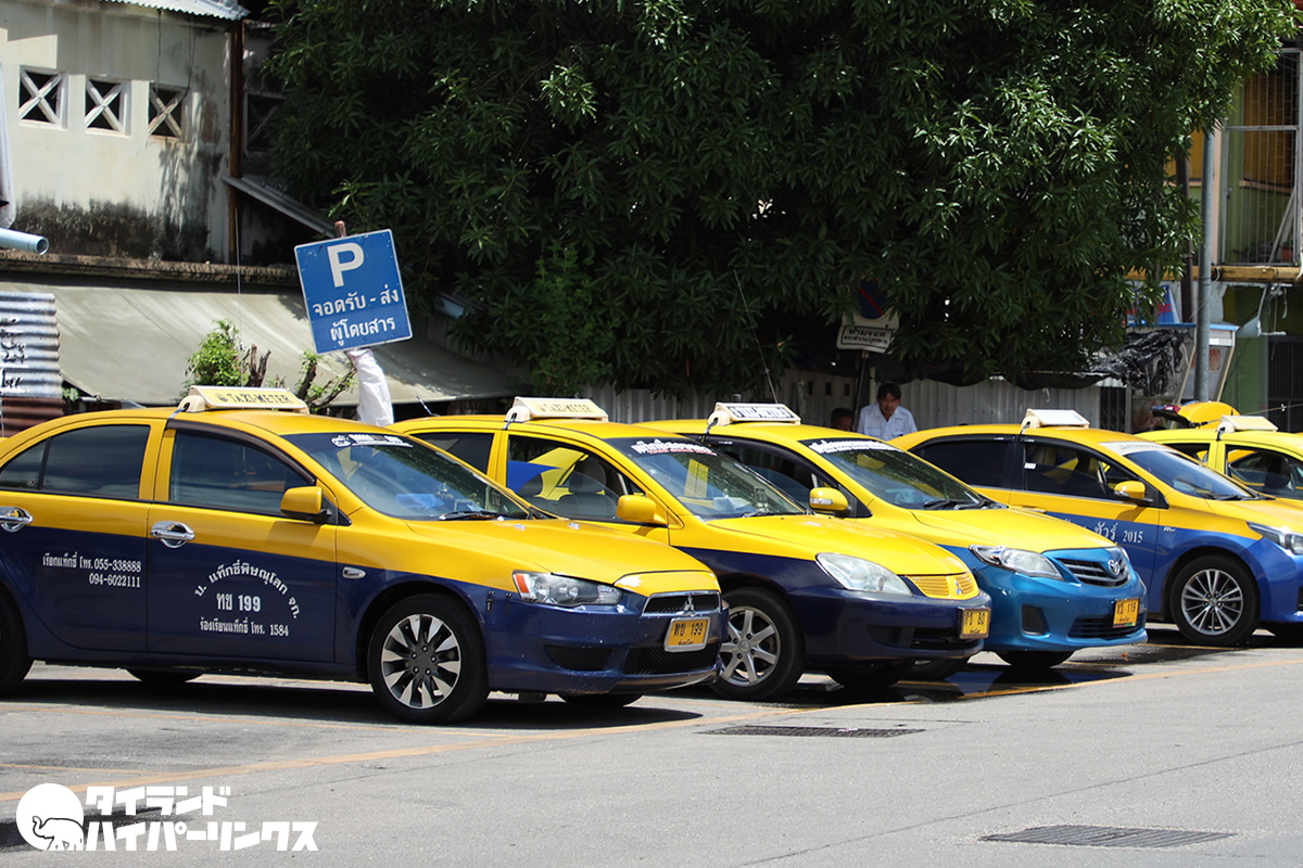 街中ではそれほど走っているタクシーは見かけないのですが、国鉄ピサヌローク駅近くには、沢山のタクシーが停まっています。バンコクとほぼ同じ様なスタイルで、助手席前の表示版にある「ว่าง(ワーン)」という文字が空車の印です。