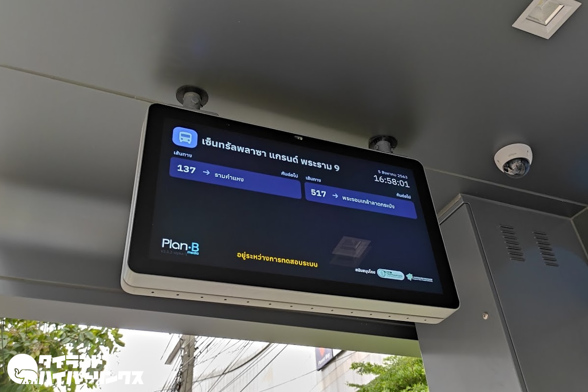 「スマートバスシェルター」の大きな特徴の一つは、これから到着するバスの番号が表示されるモニターがあること。思い返せば、以前同じ様に到着するバスの番号が表示されるモニターが、サイアムセンターの前にも置かれていましたね。