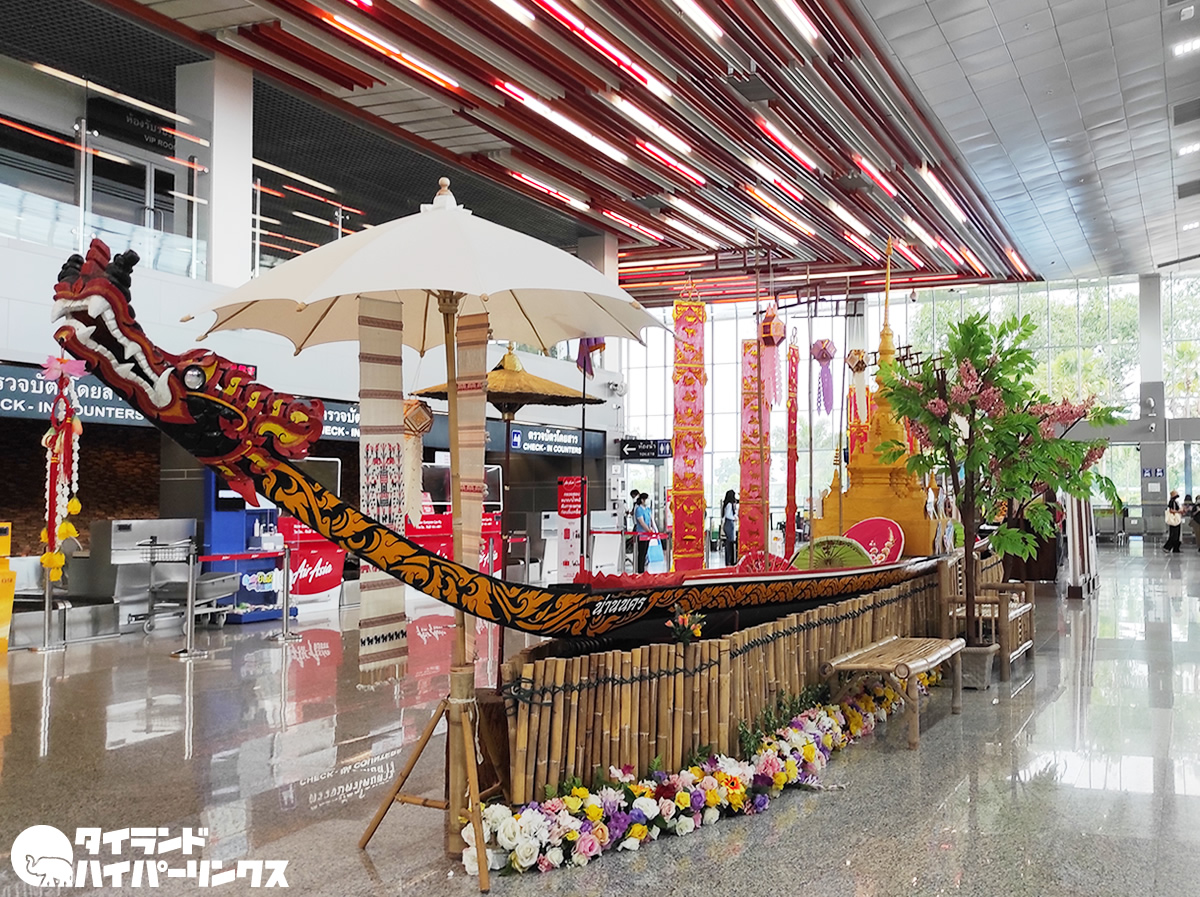 タイ北部ナーン県のナーンナコン空港のロビーには、真ん中にドカンと大きな長いボートが展示されています。これは毎年ナーン県を流れるナーン川で開催されるボートレースで使われるものなんだそうで。そういえばなんとなく、ボートレースの映像を見たことがあるような・・・。