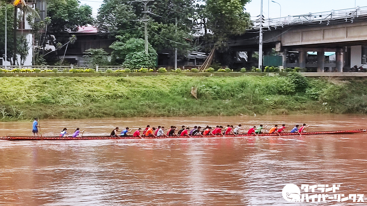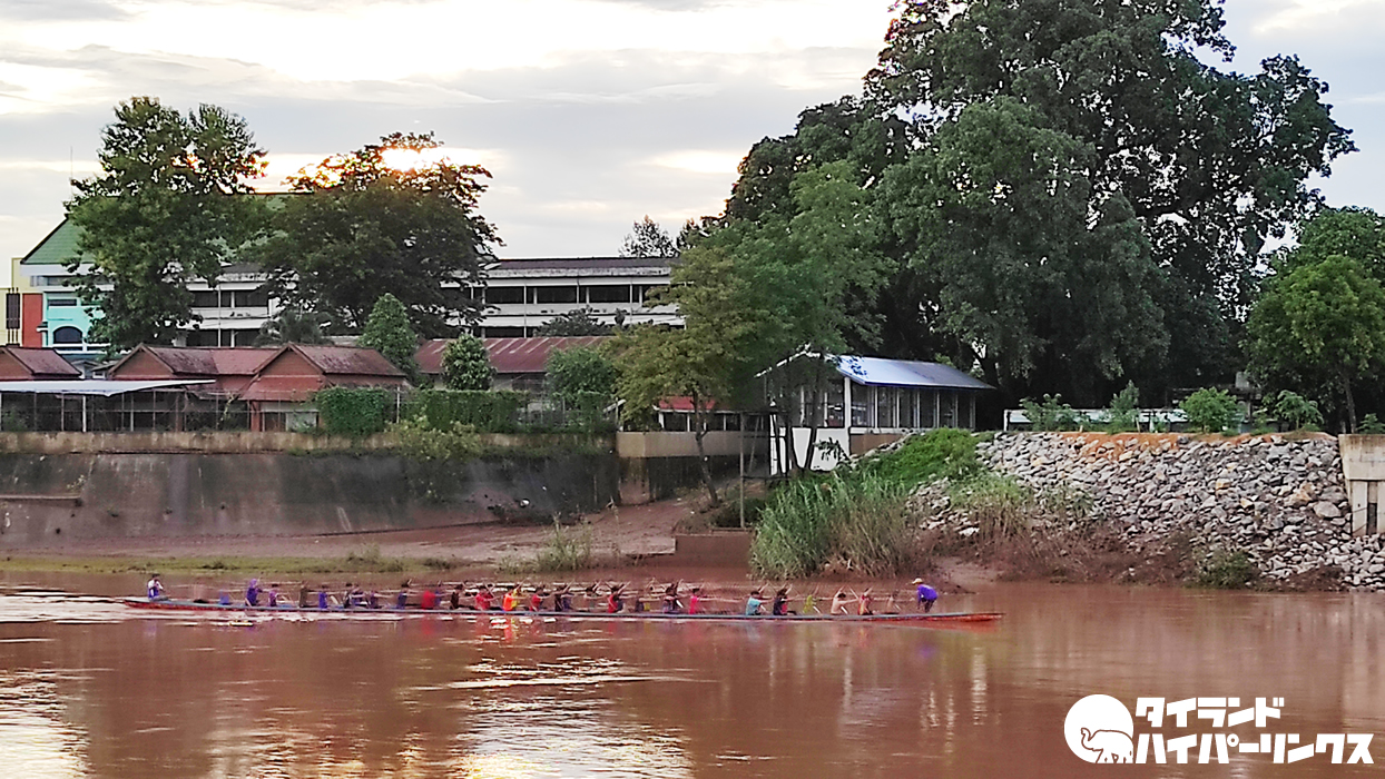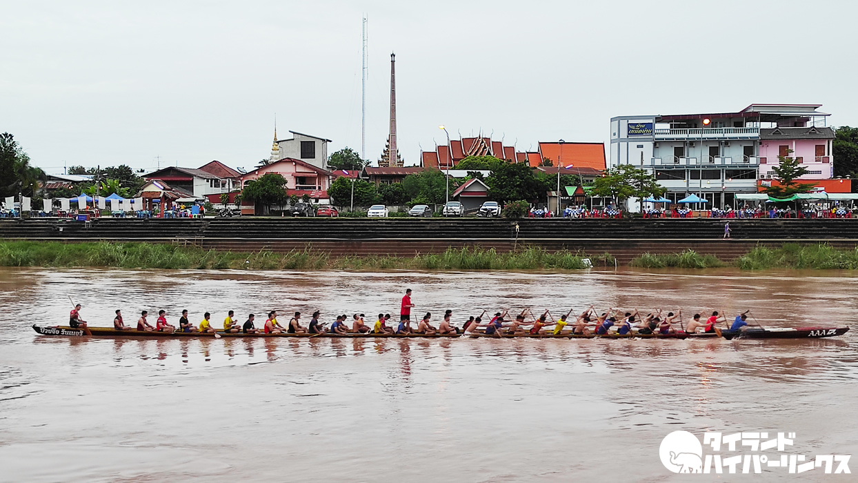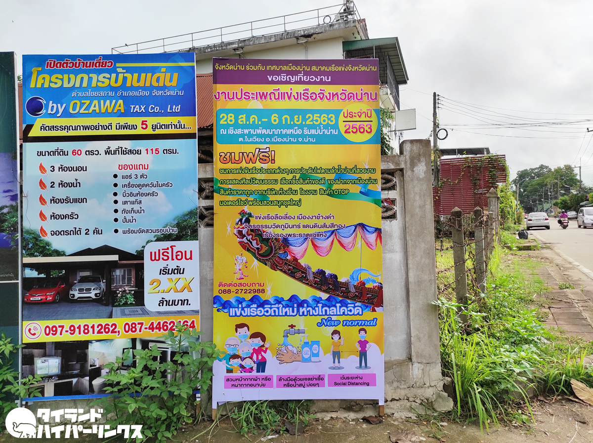 なお、こちらが街のあちこちにあった「ナーン県伝統ボートレース祭(งานประเพณีแข่งเรือจังหวัดน่าน ガーンプラペーニーケンルアチョンワットナーン)」の立て看板。2020年8月28日からのようで、間もなく開催。練習にも力が入るわけですね!