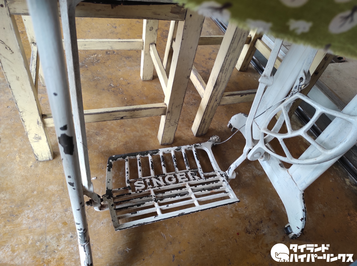 一部テーブルにはミシン台が使われていて、なぜかそれだけで高まる気分(笑)。