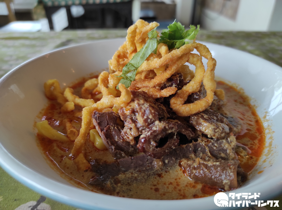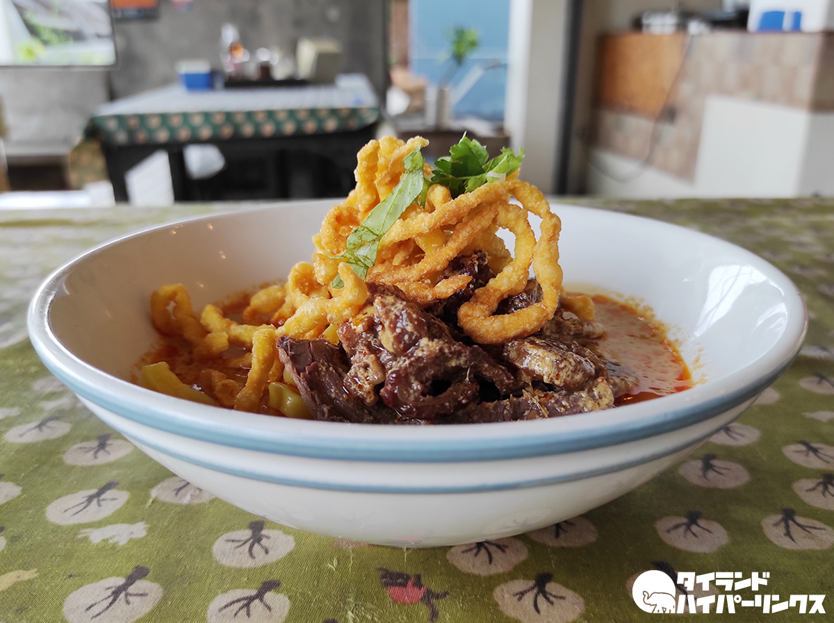 待つこと数分。運ばれてきた「カオソーイヌア」がこちら。牛肉たっぷりで、見た目も美しいカオソーイです。