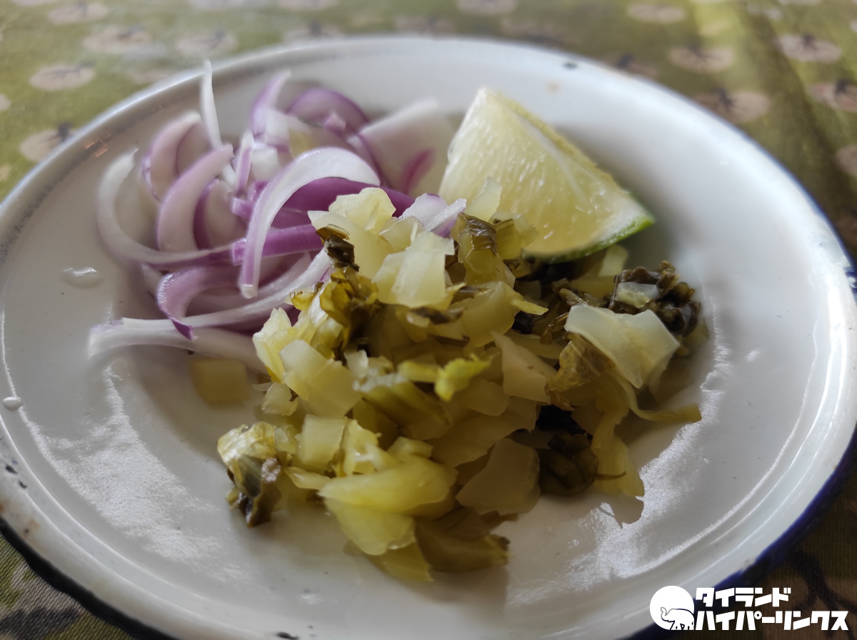 早速付け合せの玉ねぎ、パカドーンと呼ばれる漬物、そしてマナオ(ライム)を入れて、いただきます。
