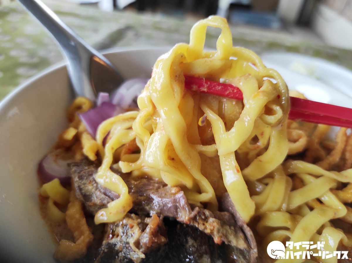 今回オーダーしたのは牛肉の入った「カオソーイヌア(ข้าวซอยเนื้อ)」(60バーツ)です。考えてみたらいつも鶏肉のカオソーイばかり食べていて、牛肉のは初めてかも。