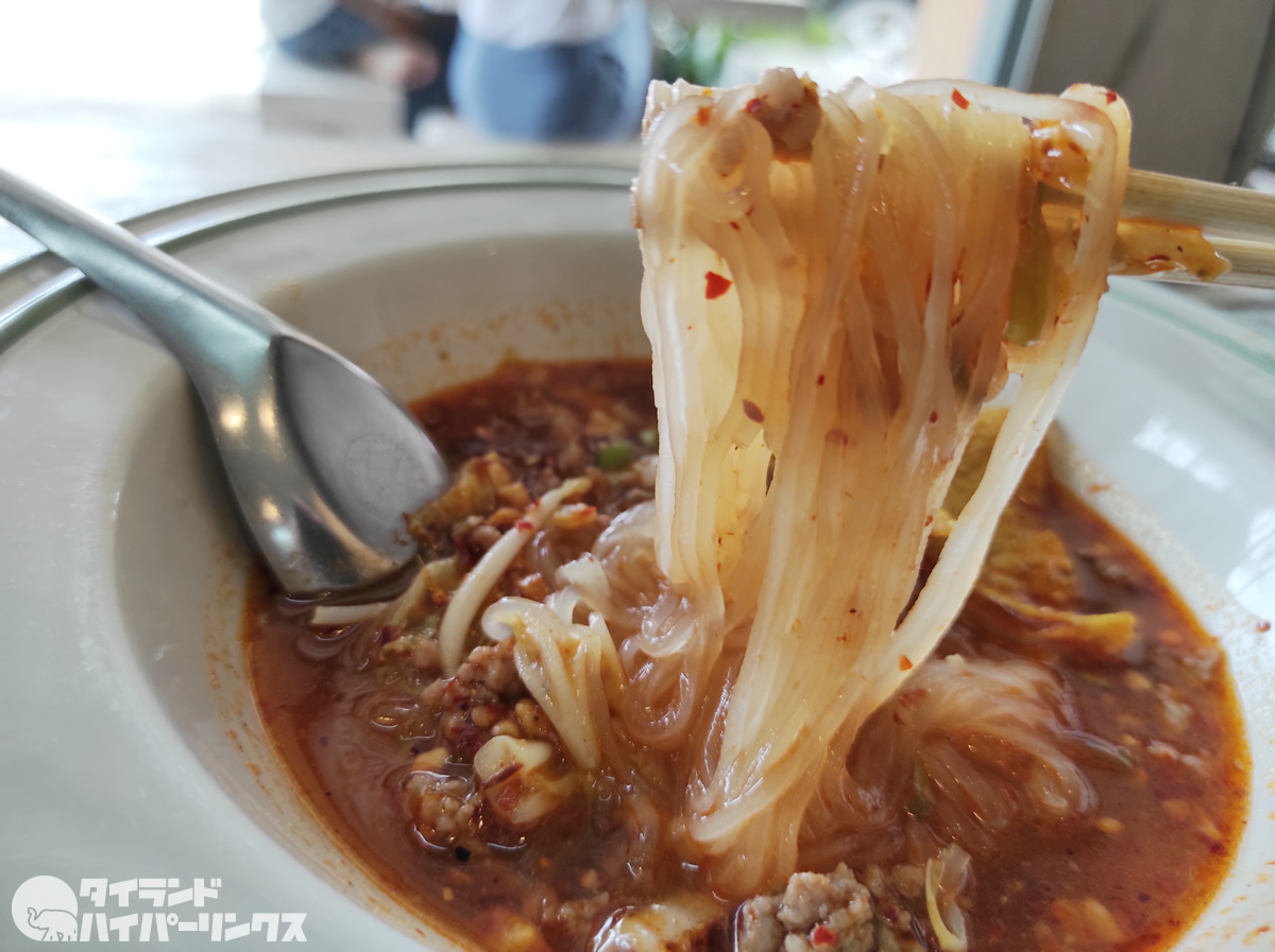 これがタイの女子高生たちのハートを掴む、濃厚スープの酸っぱめトムヤムヌードル。量は少ないですが、あちこち食べ歩きたいので、これで十分。
