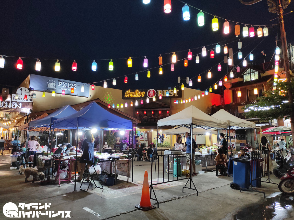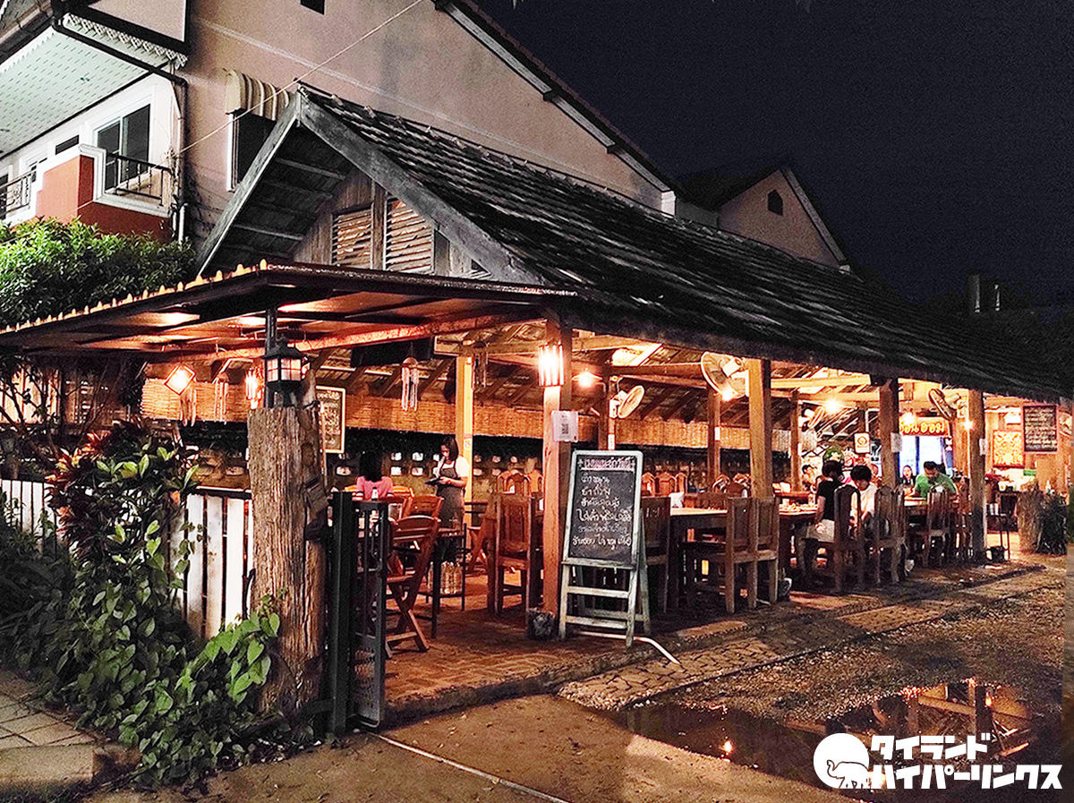 この日訪れたのは、ナーン中心部のスリヤポン通りにある「フアンホーム(เฮือนฮอม HuenHorm)」。ナーン土産が並ぶOTOPセンターの、道路を挟んで向かい側にあるレストランです。下の写真のように、OTOPセンターの前は屋台が出て、ちょっとしたナイトマーケット風になっていましたが、「これぞ北タイ料理!」という品がなかったので、向かいの「フアンホーム」に決めたのです。