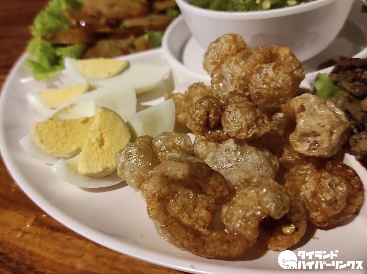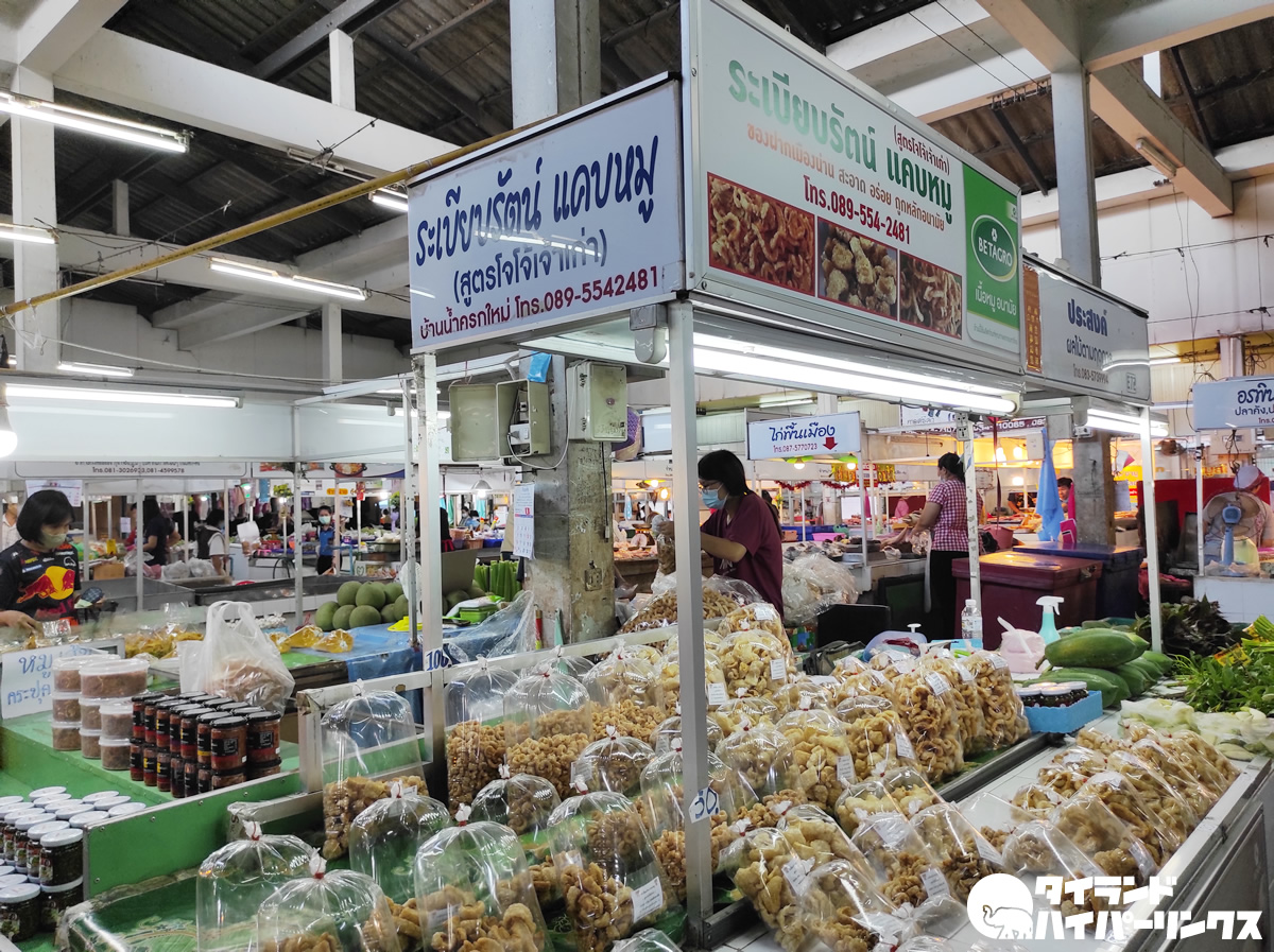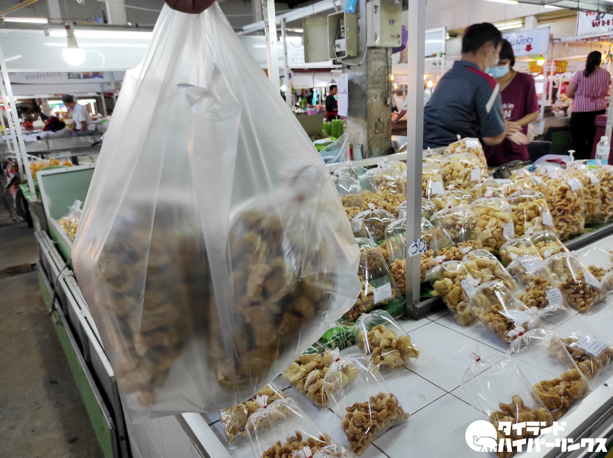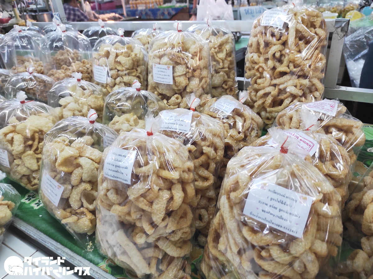 今回ここに来た目的は、「お土産に買ってきて」と頼まれたケープムー(แคบหมู)を探すため。ケープムーとは、豚の皮を素揚げしたもので、北タイの名物ですね。先日行ったレストランでも、北タイ料理の盛り合わせに入っていました。