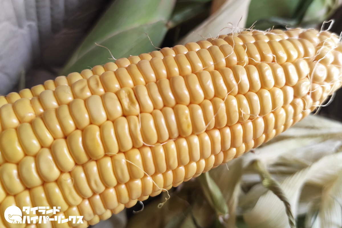 タイでもトウモロコシはよく食べられています。街中でも茹でた(または蒸した?)トウモロコシが売られていて、粒にバターと砂糖をまぶして甘~くして売っていたりします。「カオポートクルックヌーイ(ข้าวโพดคลุกเนย )」と言って、とっても美味しいですけど食べ過ぎたら確実に太ります。