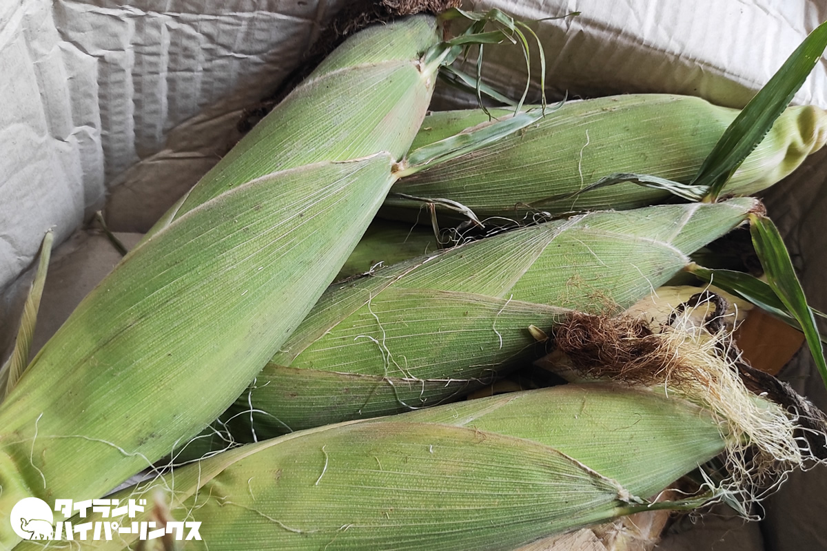 そんなトウモロコシ、タイ語でカオポート(ข้าวโพด)をネットで購入。日本ではトウモロコシがいくらするのか分かりませんが、今回購入したのは3キロ(8本)で90バーツ(約300円)でした。発送元はパトゥムターニー。パトゥムターニーにはタイ最大の生鮮食材卸売市場「タラート・タイ(ตลาดไท)」があって、そこから送られてきたようです。
