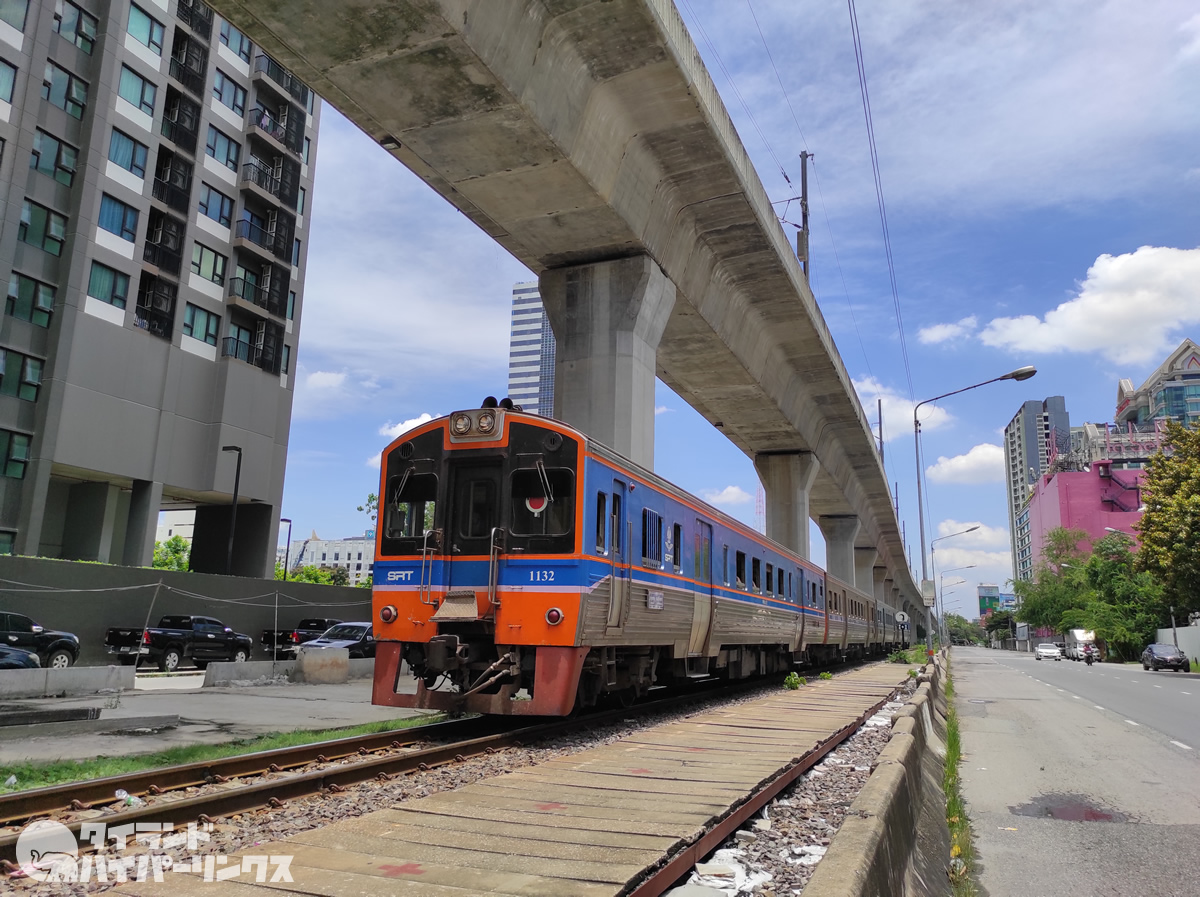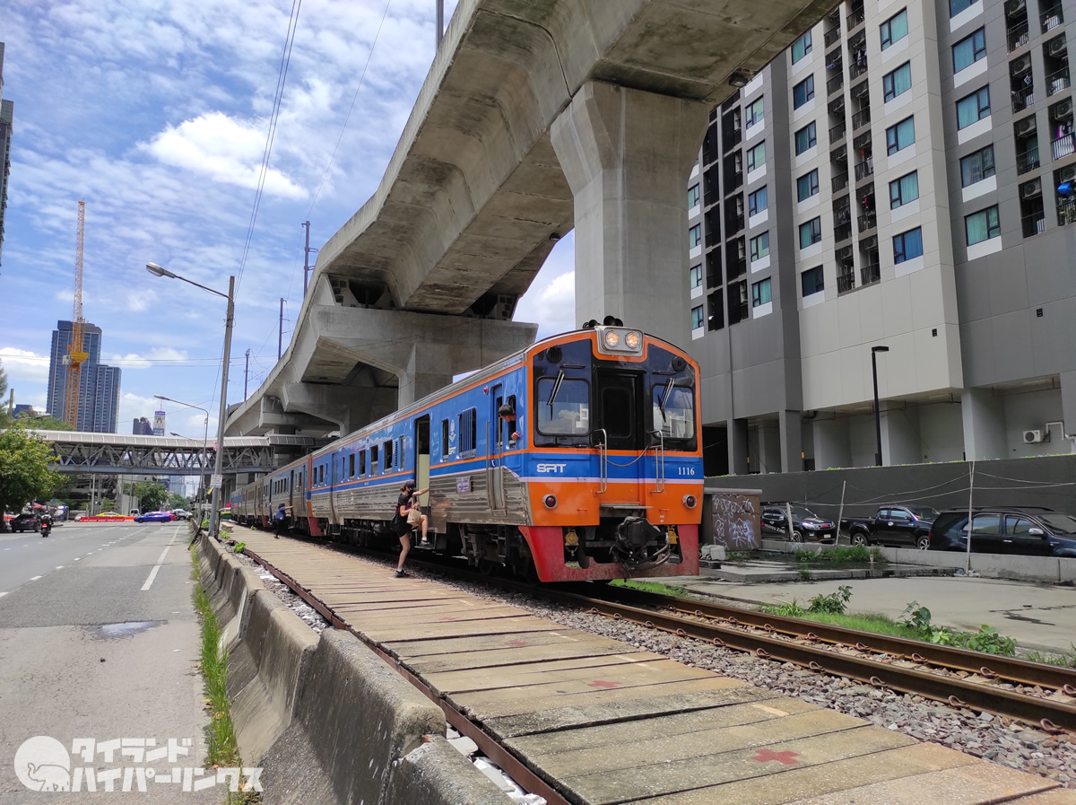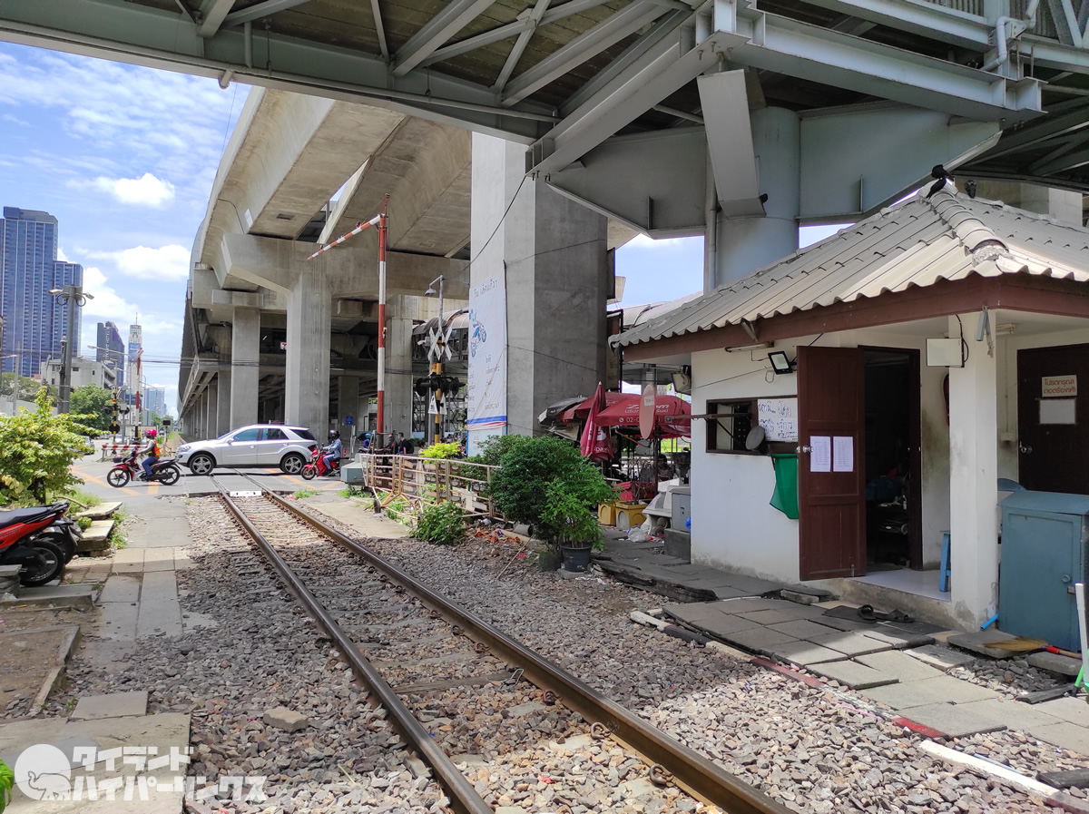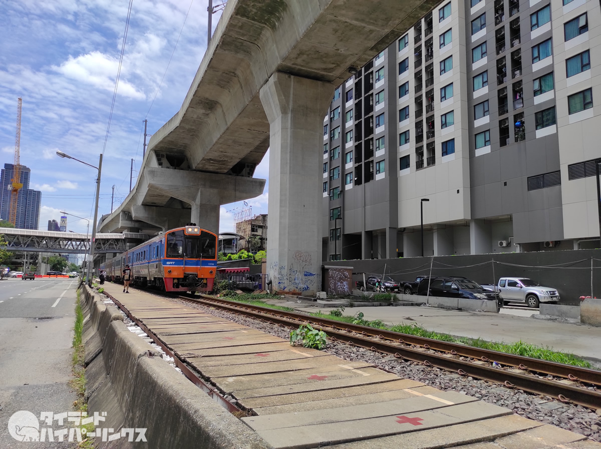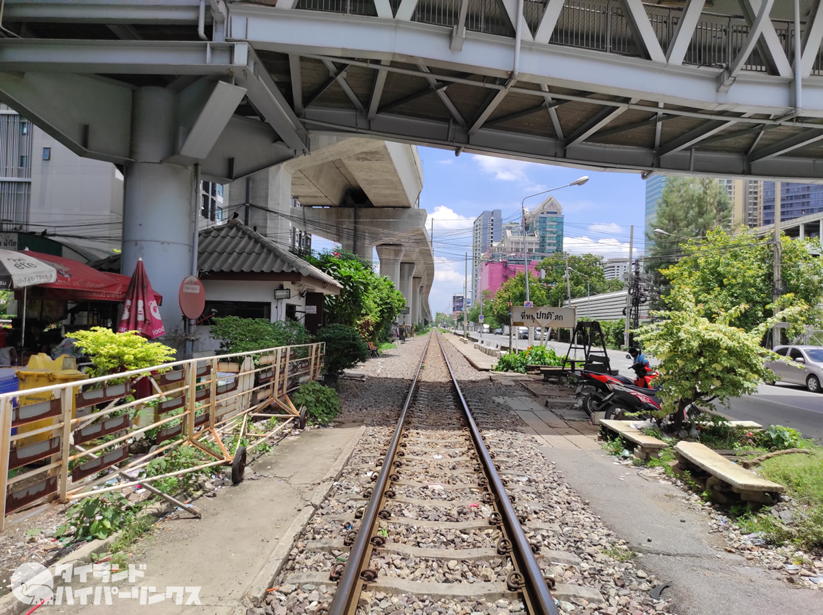 正確には駅とは違うのかも知れません。タイ語で鉄道駅は「สถานีรถไฟ (サターニーロットファイ)」。しかしここは「ที่หยุดรถ(ティーユットロット)」と書かれているので停留所?タイ国鉄アソーク停留所でしょうか?