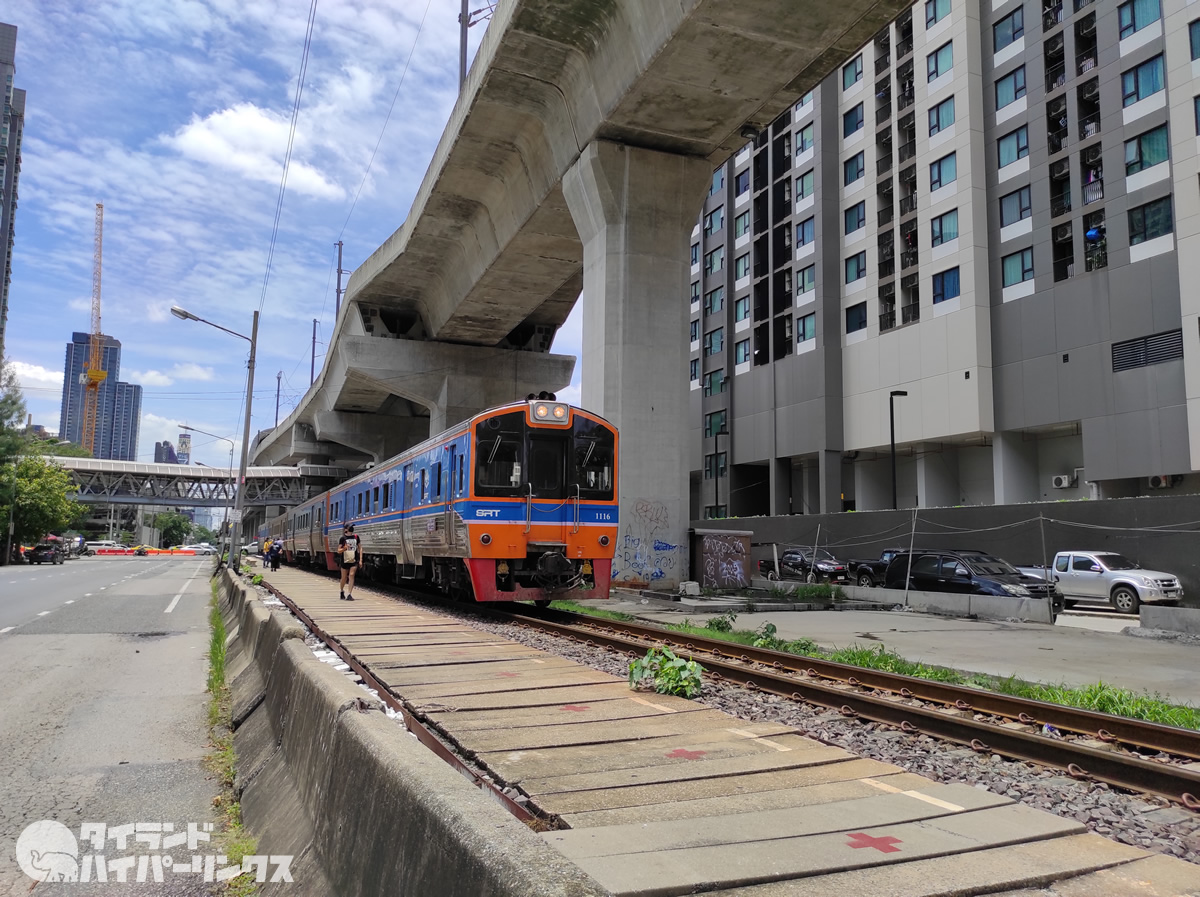 バンコクの街を散歩。ペップリー通りの北を平行しているカムペーンペット7通りを歩いていると、線路に入ってる人たちがいました。「どういうこと?」と思ったら、そこはタイ国鉄アソーク駅で、線路に入っているのでなく駅のホームで列車を待つ人たちだったのです。