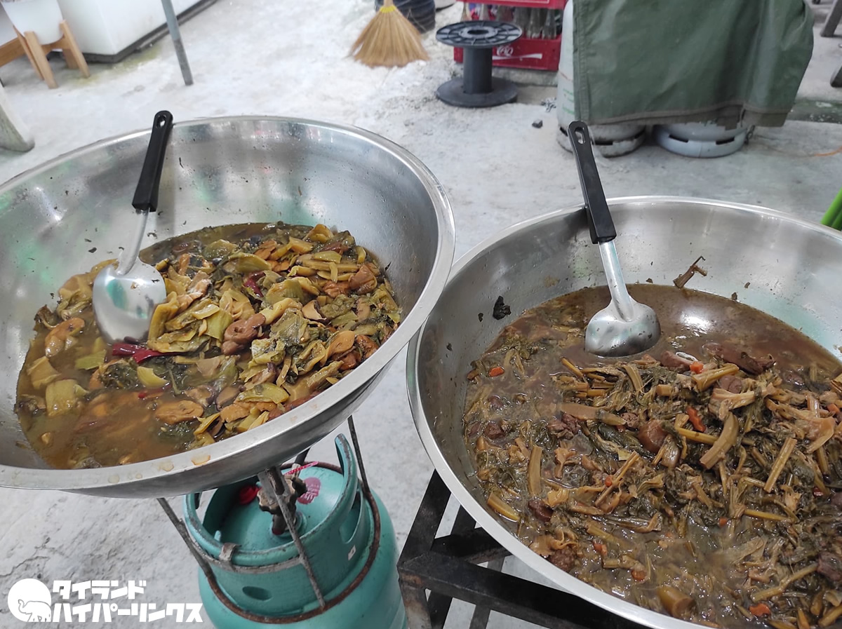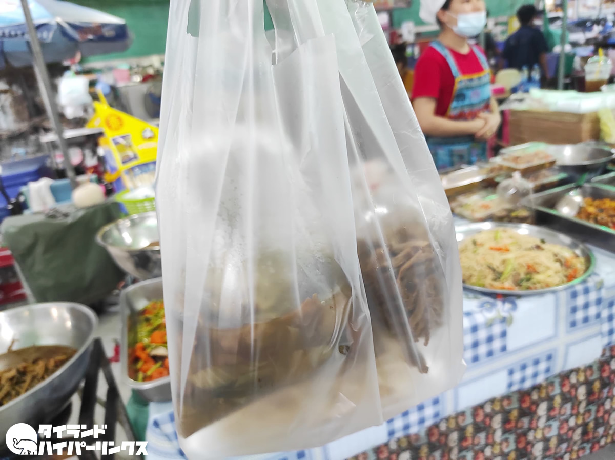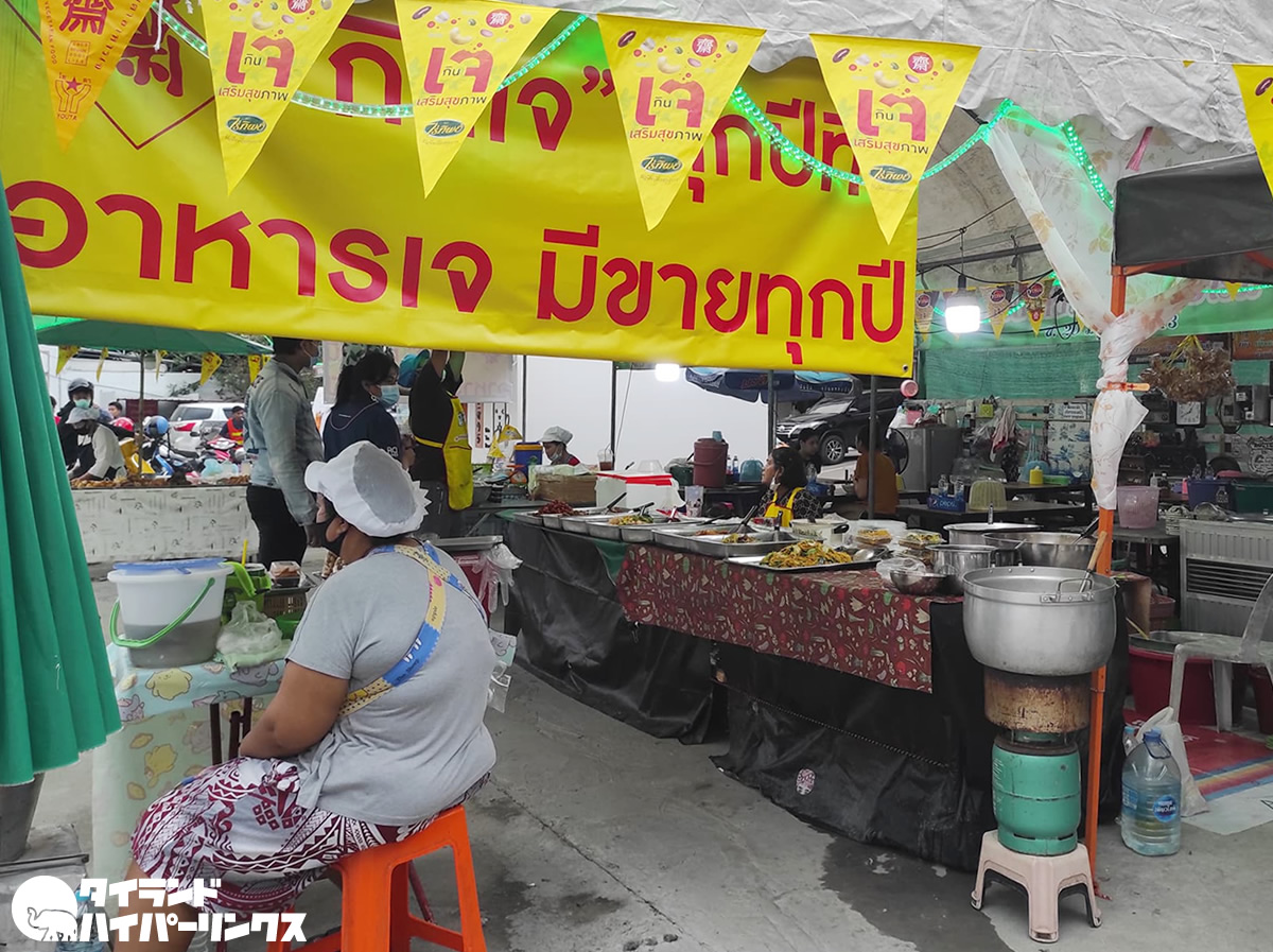 街では黄色い旗が掲げられて、キンジェー料理が販売されています。今シーズンはまだキンジェー料理を食べていなかったので、通りがかった市場(タラート)で買って帰ることにしました。この市場には、キンジェーコーナーが設置されています。