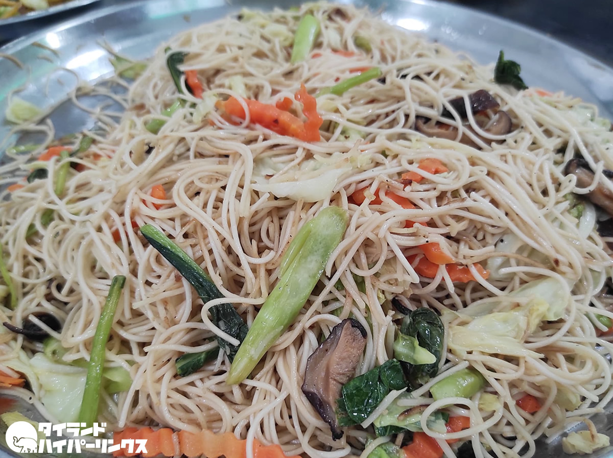 キンジェー焼きそば「パットミースアジェー(ผัดหมี่ซั่วเจ)」など3品を購入して、120バーツ。キンジェー焼きそばは、油抑えめで、比較的ヘルシーでしたよ!