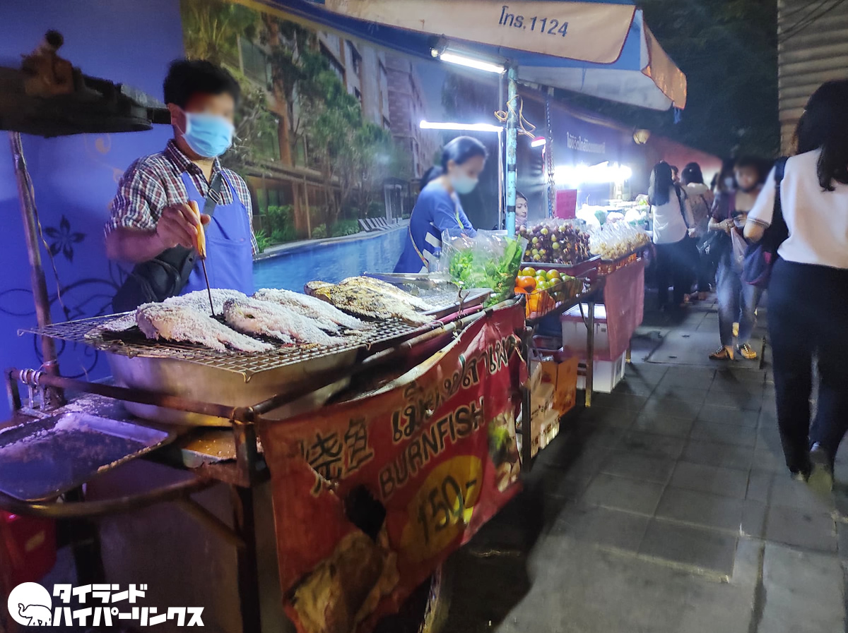 屋台が並ぶバンコクの夜の歩道。上の写真に写っているのは、とっても美味しいプラーニン(ティラピア)の塩焼きですね。仕事終わりにここで買って帰る人も多いのでしょう。その隣はフルーツ売り。他にも食料品から日用品などまで、色々なものが販売されています。これぞザ・バンコクといった風景です。