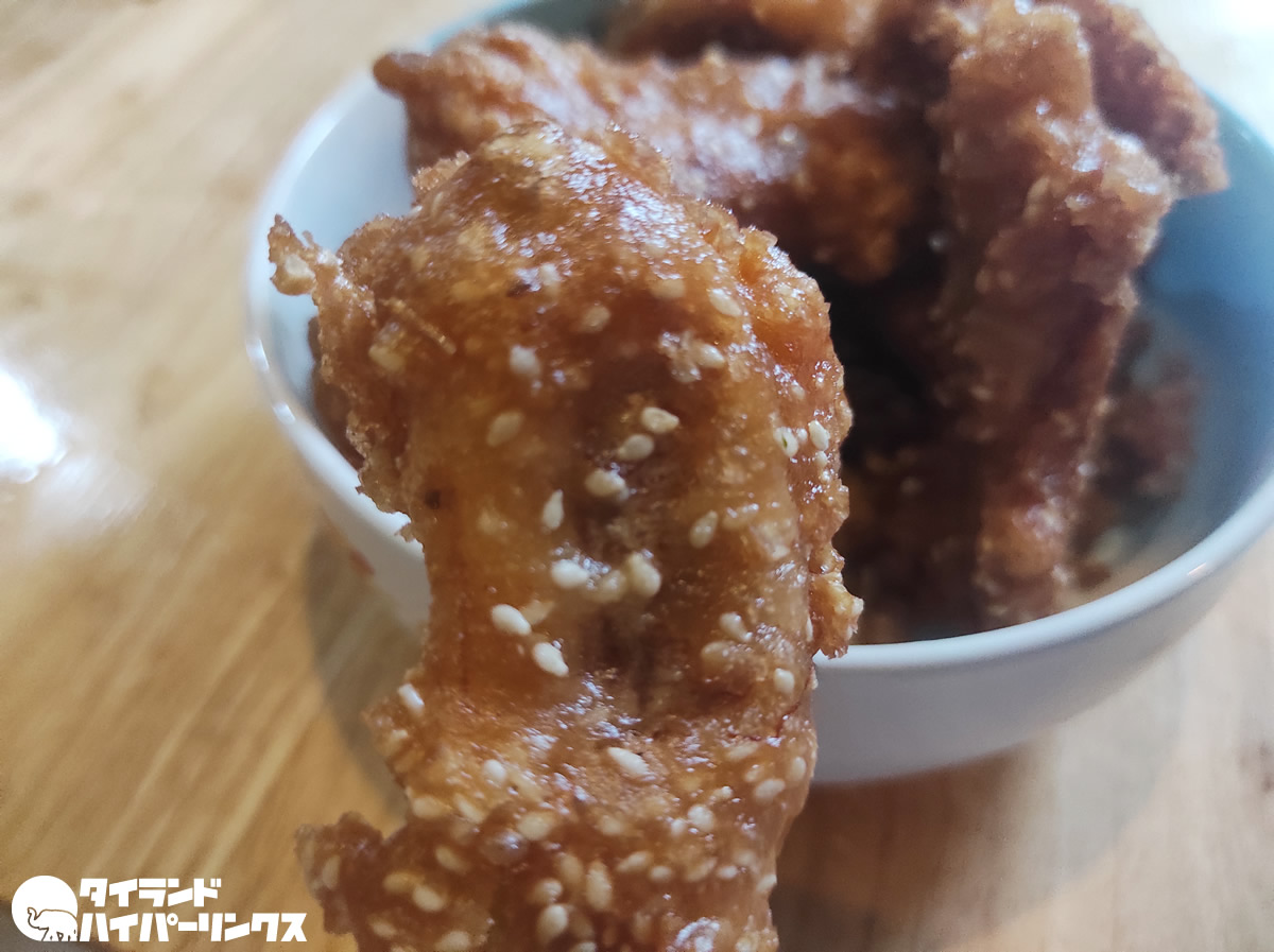 基本作り置きですが、この日は運良く揚げたてのホヤホヤ。熱々の状態で食べるとバナナがホクホクで美味しいこと、美味しいこと。しっかり味の付いた衣と白ごまが良い感じ。持ち帰って、家で皿に移す頃にはすっかり冷めていましたが、それでもなお美味しいのですから流石です。