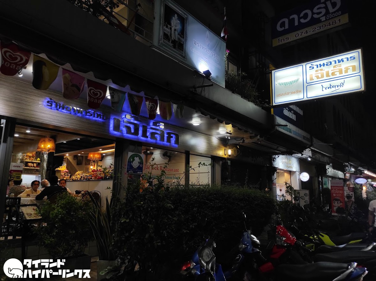 そんなわけで、マッサマンカレーを食べられるお店をインターネットで調べて、「ジェーレック・タイレストラン(Jaelek Thai Restaurant、ร้านอาหารไทยเจ๊เล็ก )」へ向かいました。店頭には“タイ版ミシュラン”とも言われる“緑のどんぶりマーク”があり、これならハズレはないと確信です。