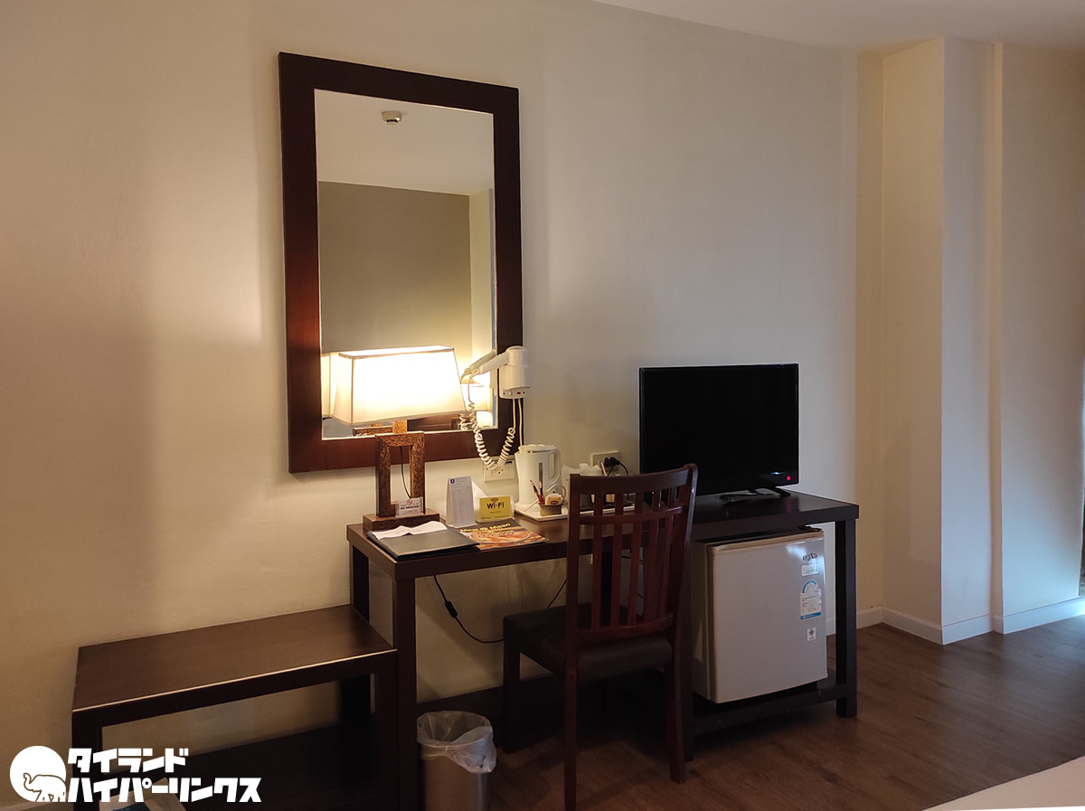 机とテレビと冷蔵庫とクローゼット。ミニバーもドライヤーもあり、Wi-Fiは快適。新しい設備ではないもの不満はまったくありません。掃除も行き届いています。