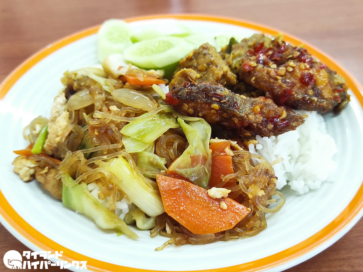 早朝には屋台もたくさん並んでいますが、食堂にも入ってみました。好きな惣菜を選んでご飯に乗せてもらう「カオラートゲーン(ข้าวราดแกง)」。3種類の惣菜が乗って、50バーツだったと思います。肉、魚、野菜、春雨、白いご飯!