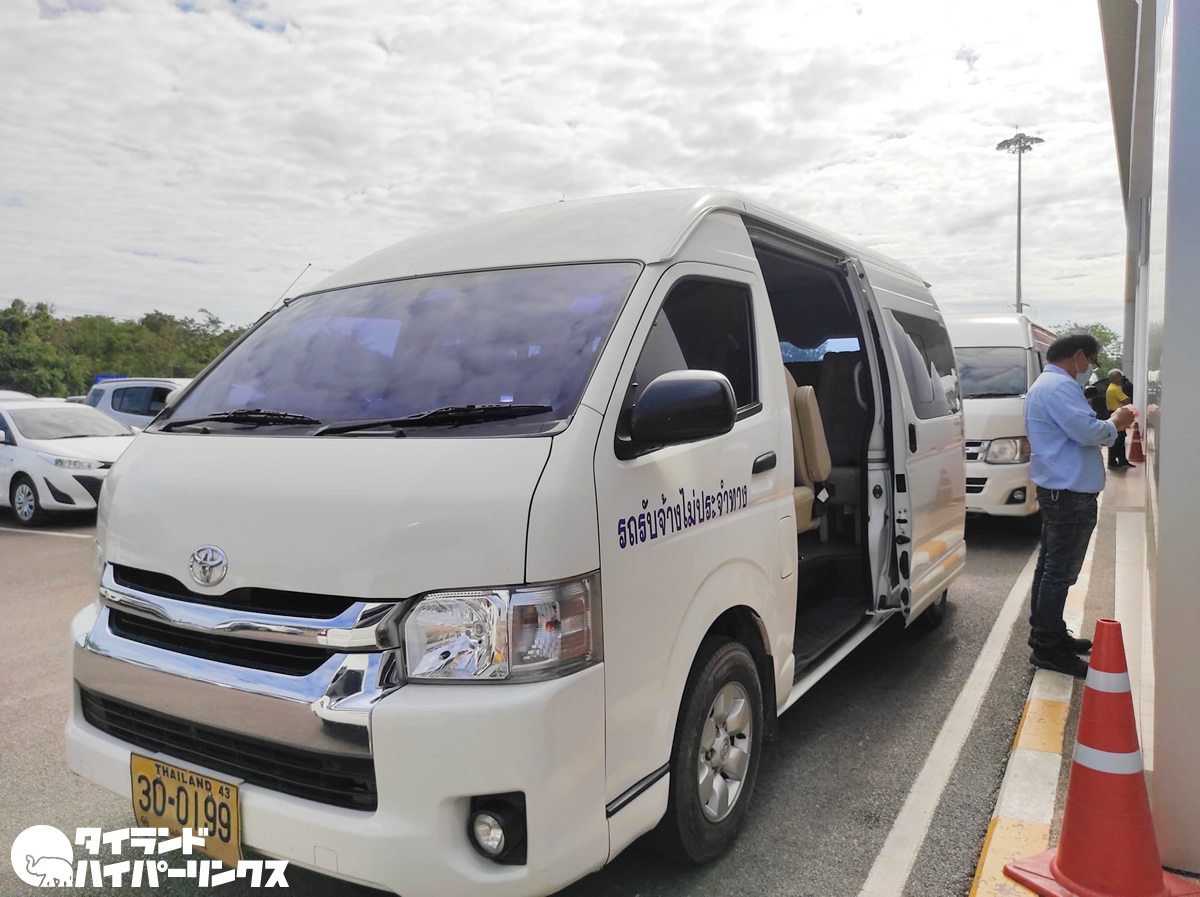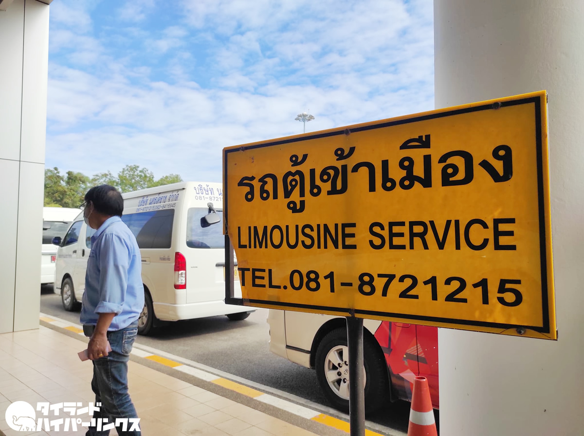 空港の外に出れば、すぐにタクシーの運転手が声をかけてくるだろうと思っていのたですが、期待は外れて誰も声をかけてきません(苦笑)。さて、どうしたものかとウロウロしていると、「リムジンサービス」の看板を発見。そこでようやく声をかけられました。行き先のホテルの名前を告げると、100バーツとのこと。どうやら「Limousine service(リムジンサービス)」というのは乗り合いのバンで、他のお客さんと一緒に目的地まで送ってくれるのですね。看板にもタイ語で「รถตู้เข้าเมือง(ロットゥーカオムアン)」、街へ行く乗り合いバンと書いてあります。