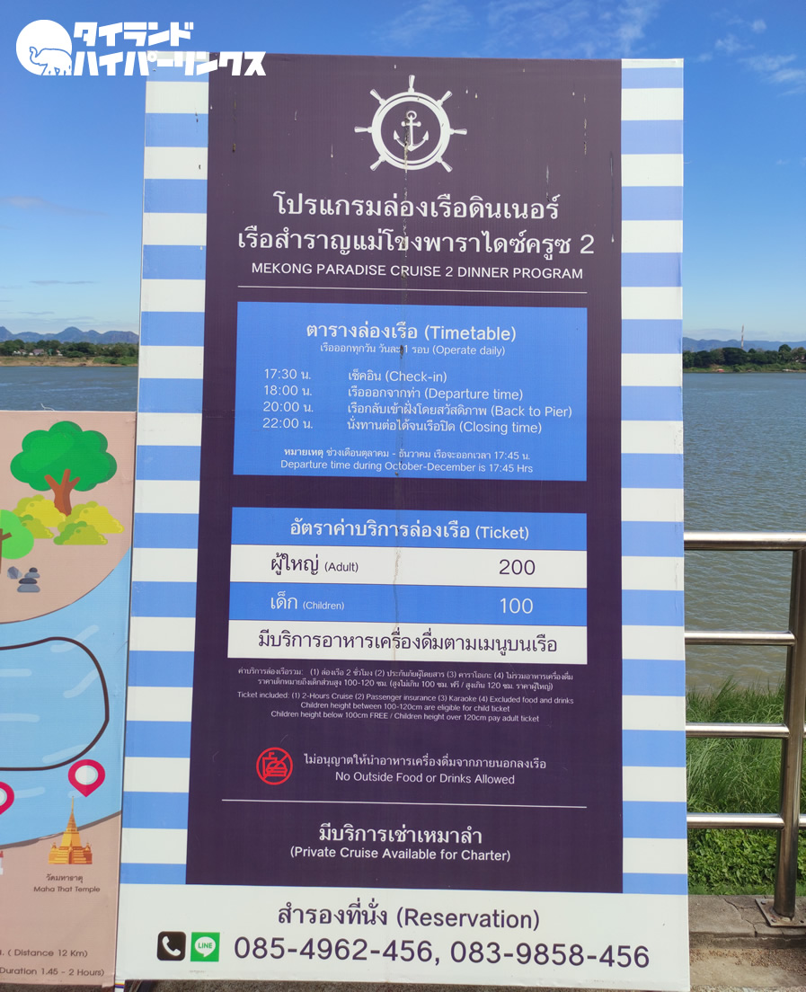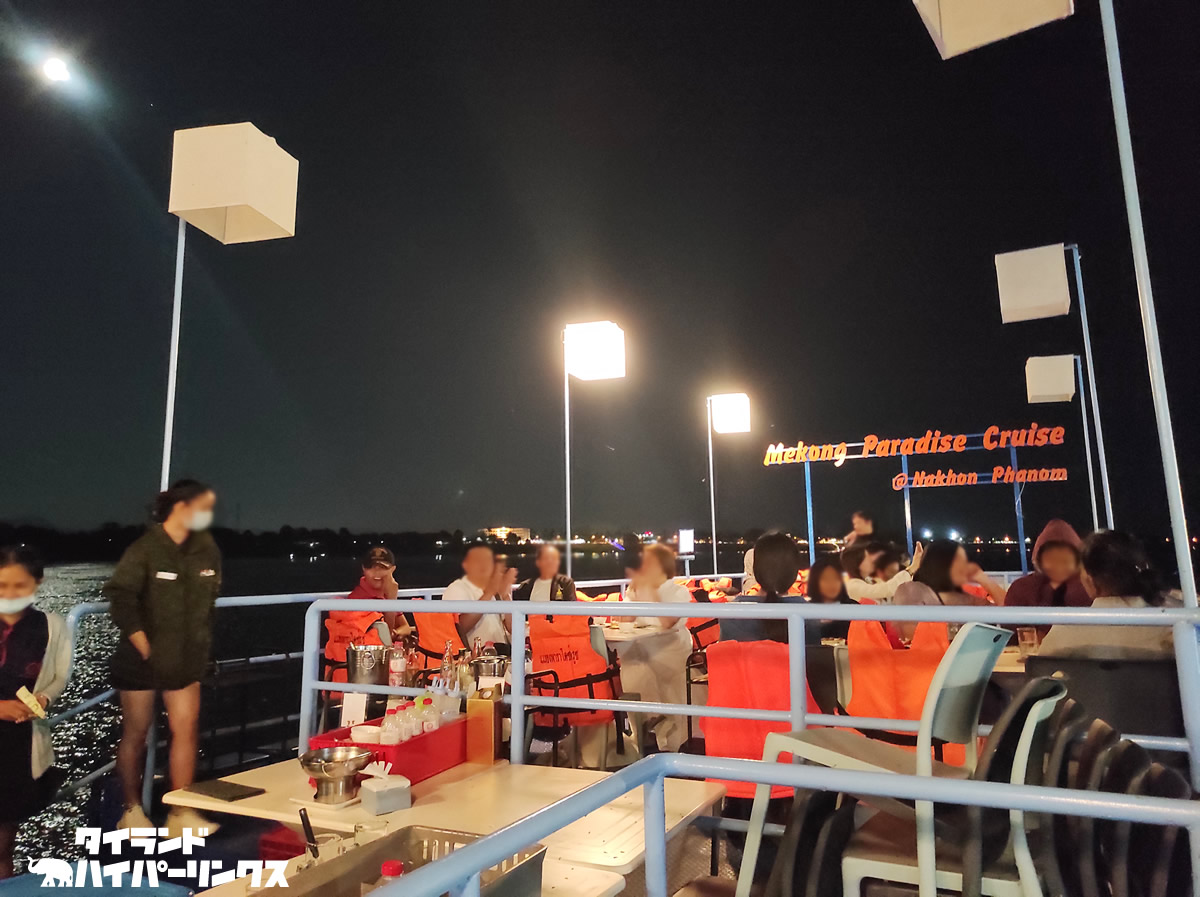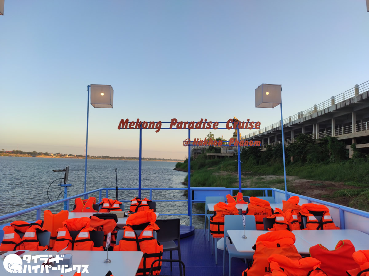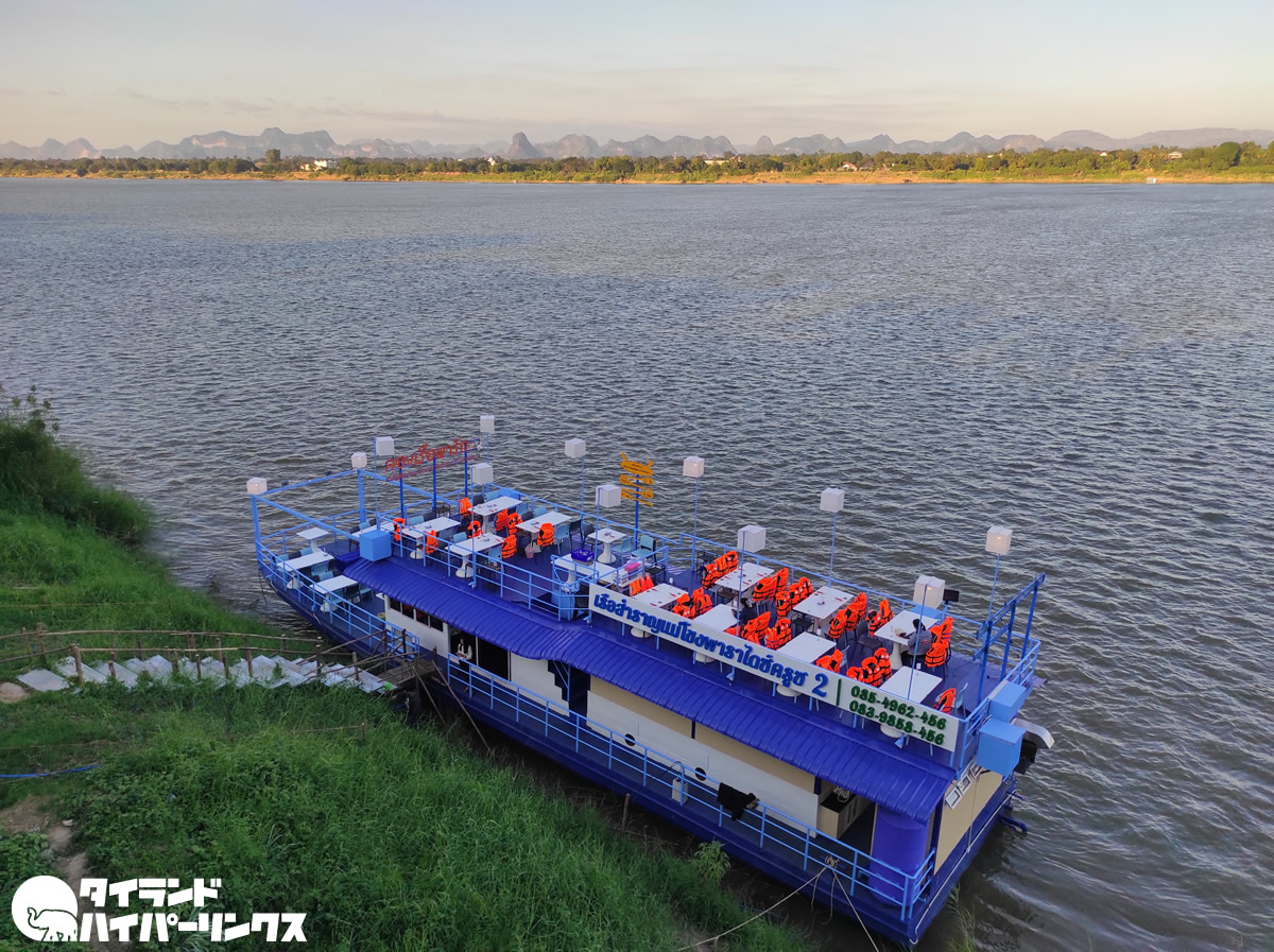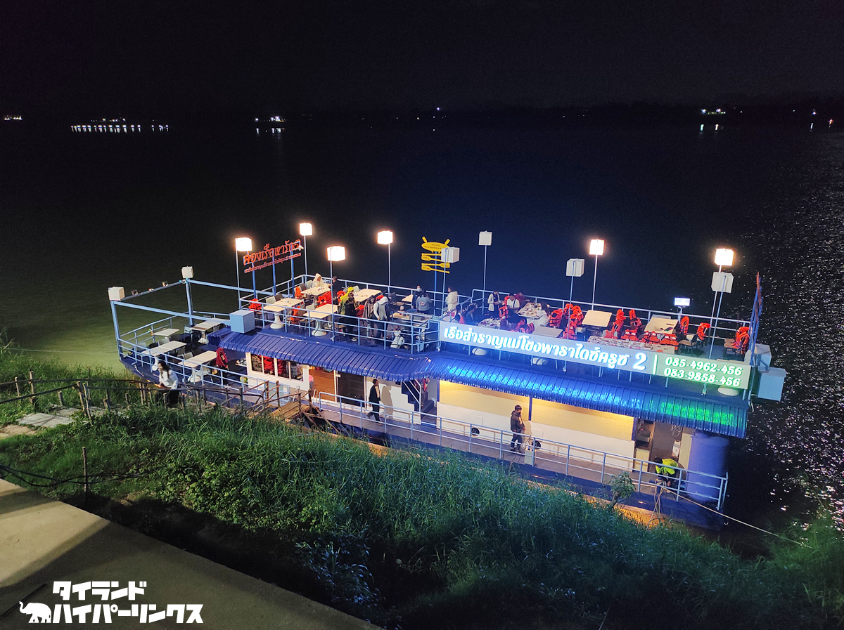 ナーガ像近くに停泊している上の写真の船「メコンパラダイスクルーズ2号」はディナークルーズ船、つまり船上レストランです。夕方6時に出発し、2時間ほどメコン川を巡り、その間食事やお酒を楽しめるというもの。こちらはチケットが200バーツで、その他食事や飲み物は別料金になります。