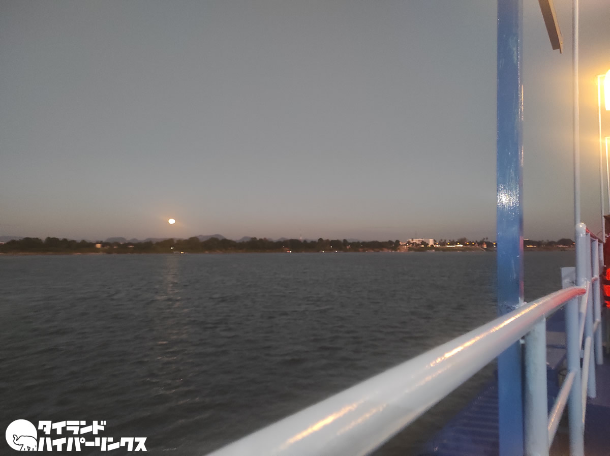 実はこの日は満月だったのですが、スマホで写真を撮ったら明る過ぎになってしまいました。メコン川の向こう、ラオスに上る満月です。