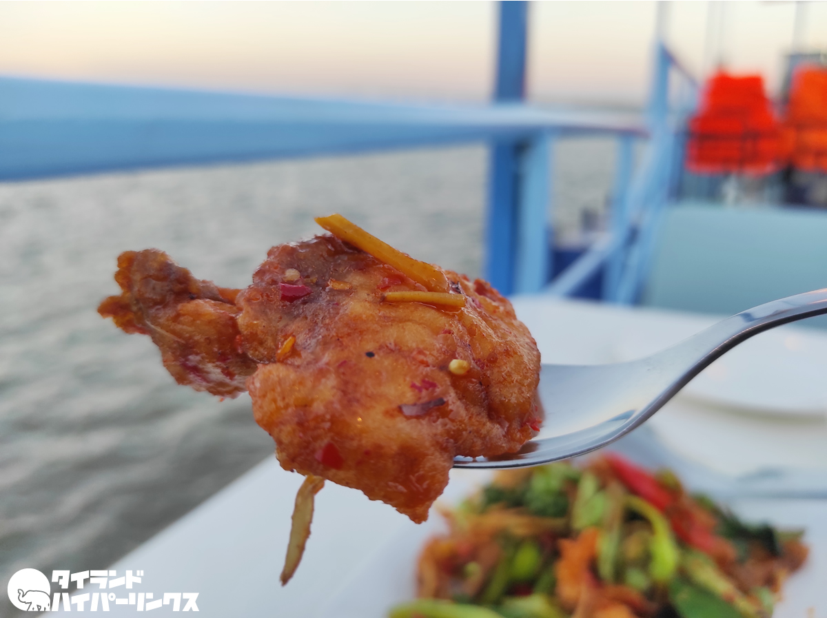 オーダーした料理一品目は250バーツ「パットチャープラーナムコーン(ผัดฉ่าปลาน้ำโขง)<Stir fried Mekong fish with Thai herbs>」。つまり「メコン魚のピリ辛炒め」。なんだか良くわかりませんが、メコン川の魚だそうです。ハーブと濃い目の味付けで、魚の臭みはなく、美味しいこと!