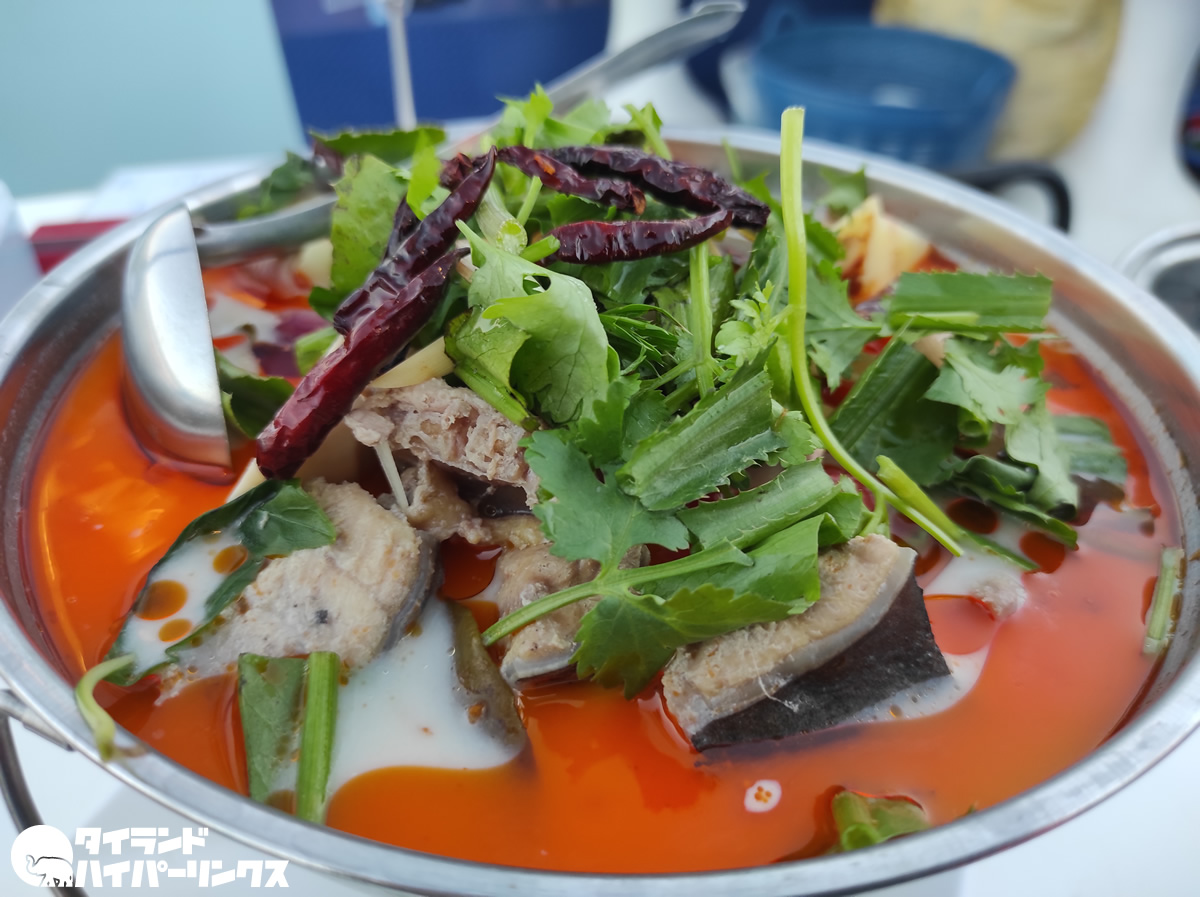 もう一品が250バーツ「トムヤムナムコーン(ต้มยำน้ำโขง)<Tom yum soup with Mekong fish>」。メコンの魚のトムヤムスープ。魚の身が「これでもか!」というほど入っています。こちらは川魚のクセを感じられるので、苦手な人は苦手かも。