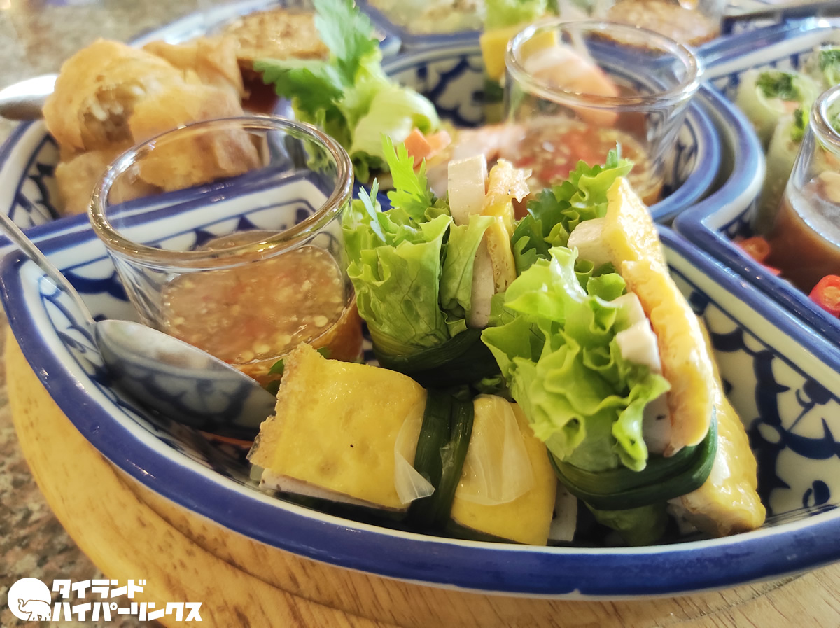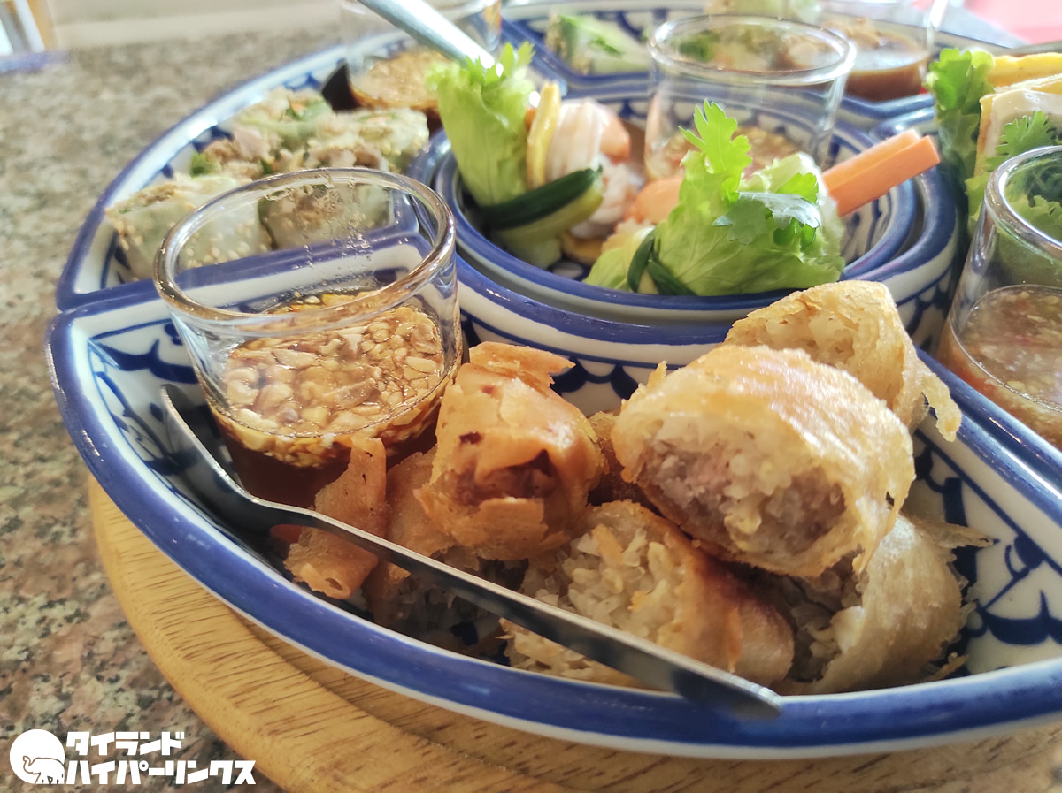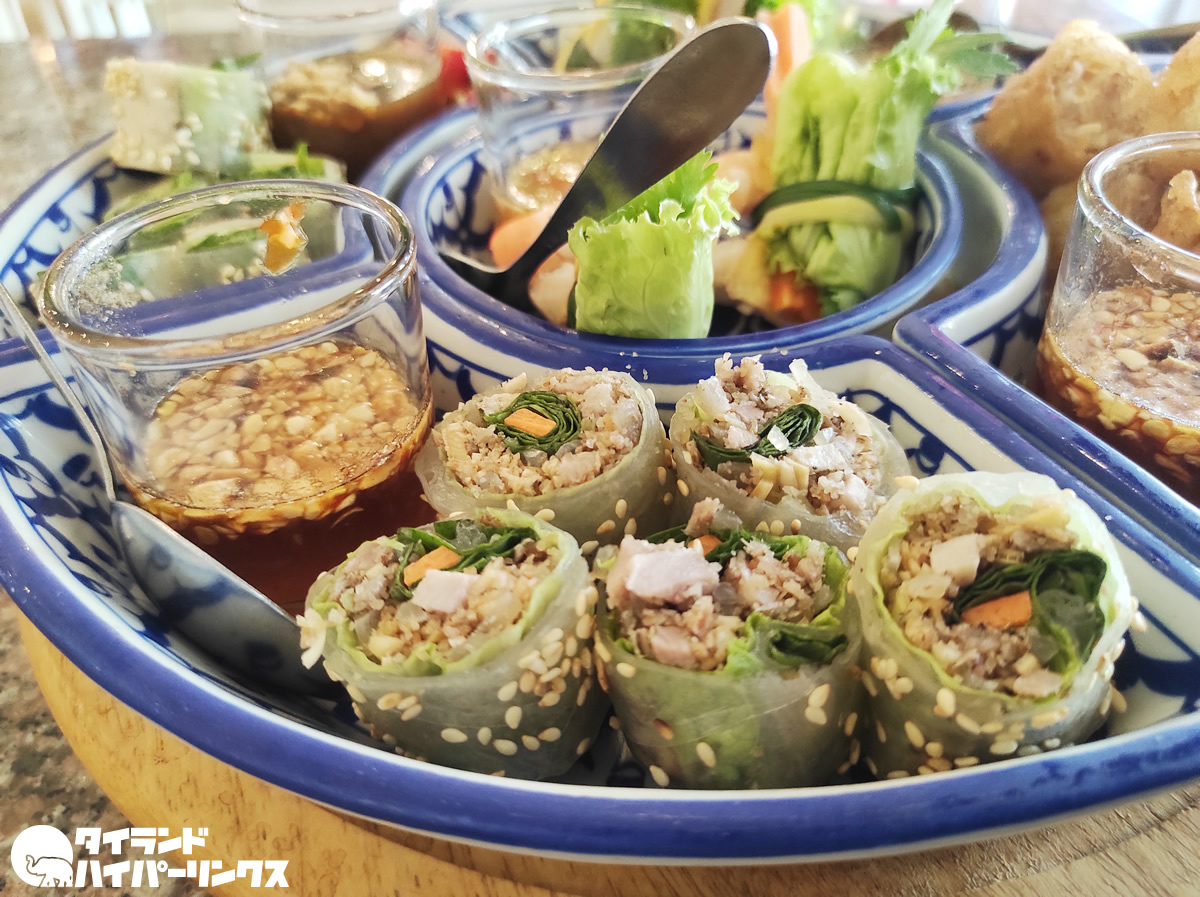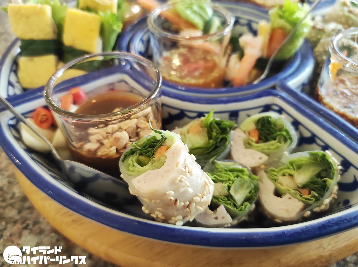 「ベトナムルアム」。生春巻きに、揚げ春巻きに、ムーヨー巻きに、エビ撒き、玉子巻き。タレは3種類あって、それぞれに合ったものが添えられています。