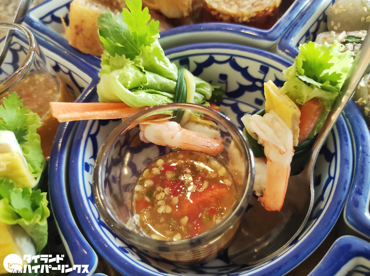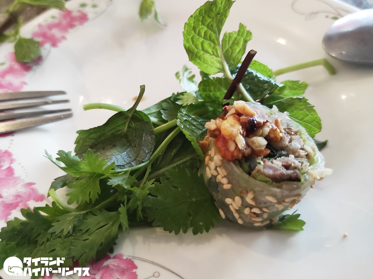 早速注文ですが、何を頼んで良いのやらさっぱりわかりません。なので店員さんにお勧めを聞くと「どんな物が食べたいですか?」との逆質問。「どんな物を食べたいのかさえも分かりません」と答えると、勧められたのが350バーツの「ベトナムルアム(เวียดนามรวม)」、つまりベトナム料理の盛り合わせみたいなものでした。