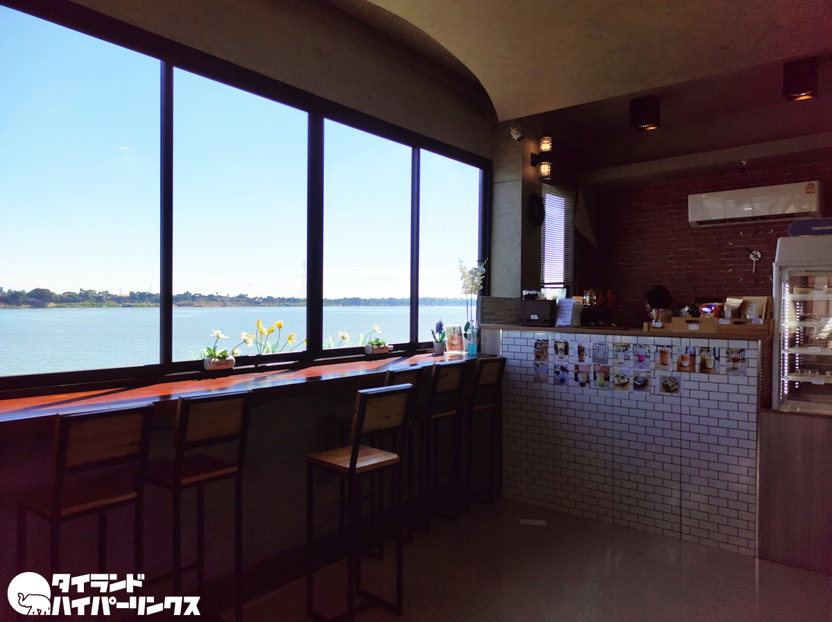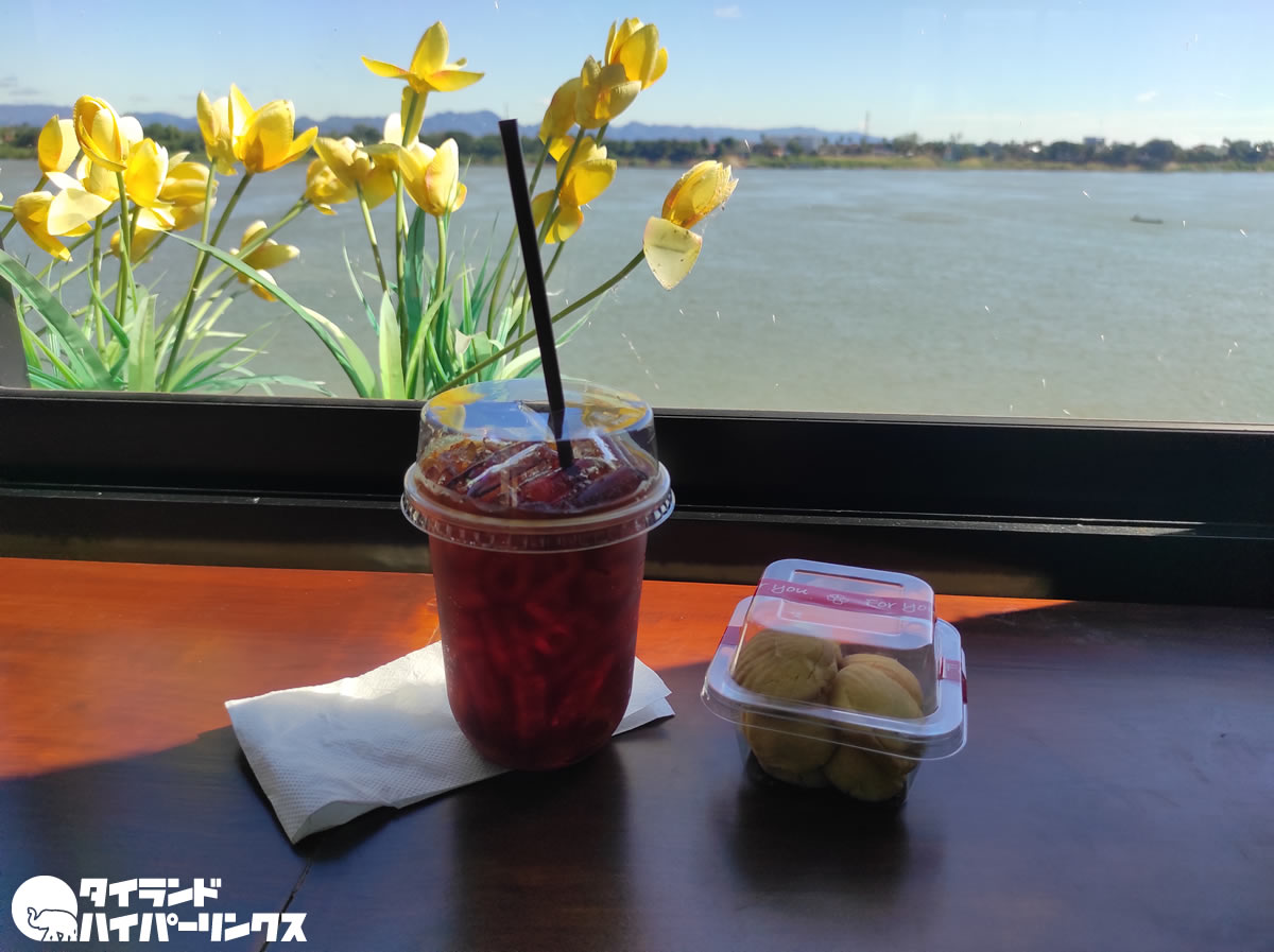 早速入って、冷たいアメリカーノ(45バーツ)と、レジ横にあったお菓子(30バーツ)を購入。メコン川が目の前のカウンター席に座ったのです。