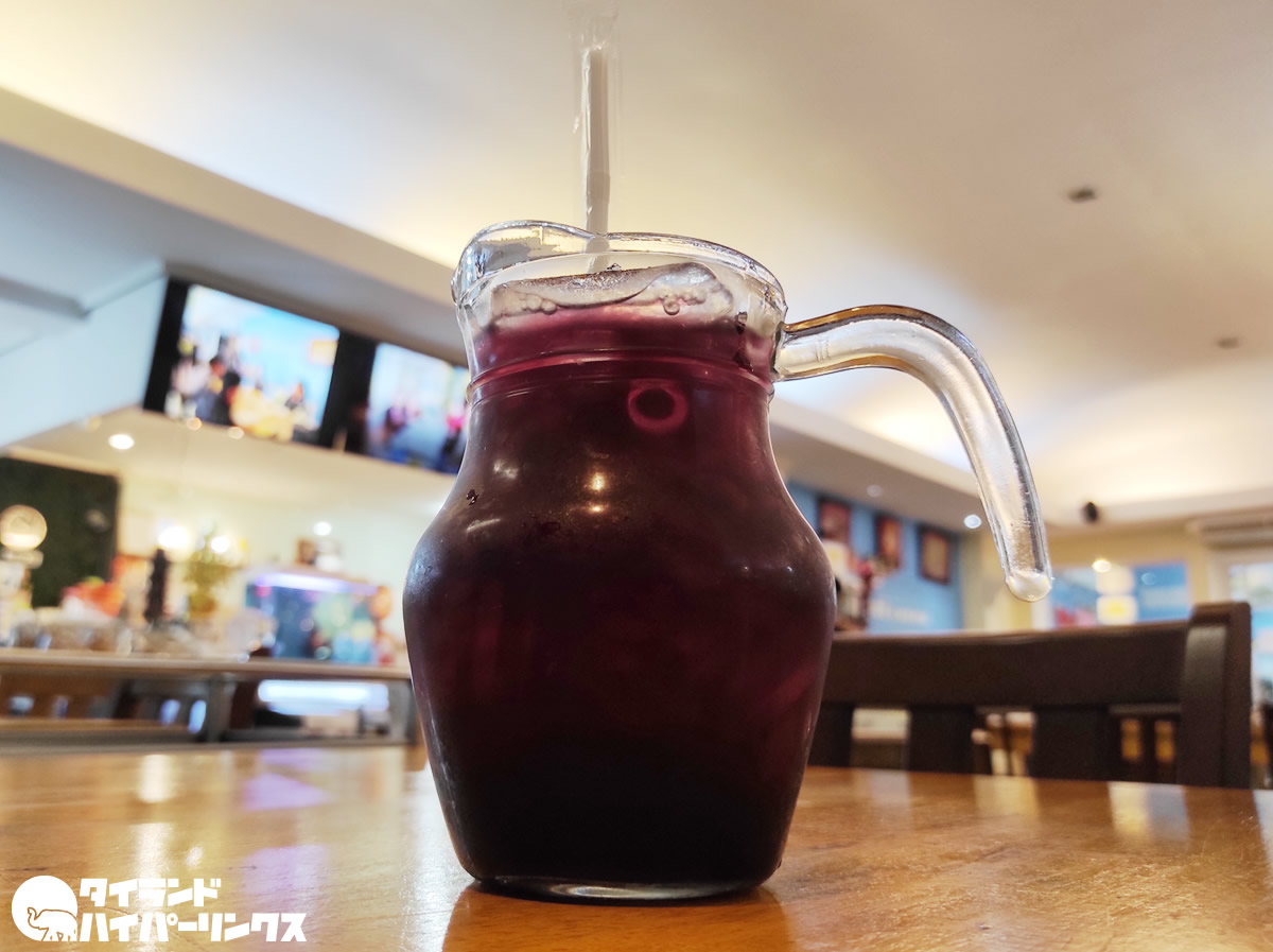 そして飲み物は青色のバタフレイピージュース「ナムドークアンチャン(น้ำดอกอัญชัน)」(25バーツ)。これで食後の口の中もスッキリです。