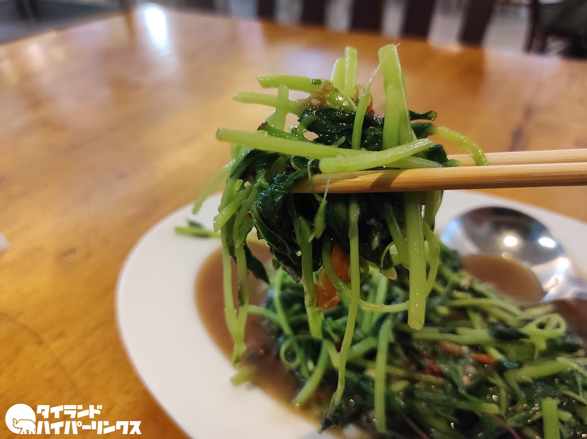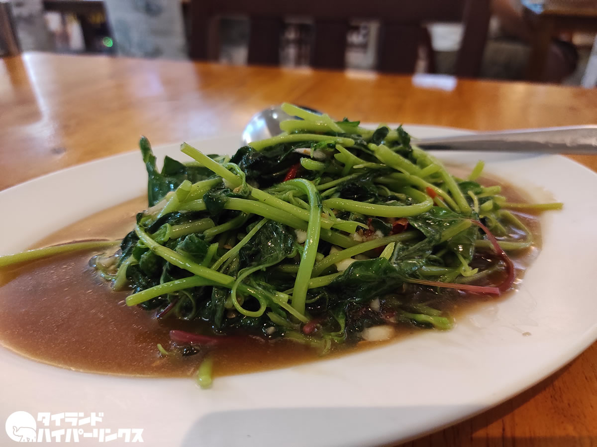 軽いものが良いと思い、まずはライスとホナガイヌビユのオイスターソース炒め「パットパクコームナムマンホーイ(พัดพักโขมน้ำมันหอย)」(50バーツ)をオーダー。