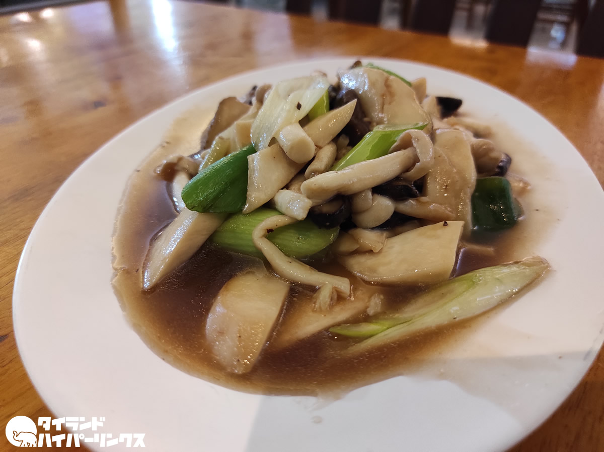 そしてもう一品。テキパキ働き、この上なく接客の良い若い男性店員さんに、どれが美味しいか聞いてみると、勧められたのが3種類のキノコ炒め「パッドヘッドサームヤーン(พัดเห็ดสามอย่าง)」(60バーツ)でした。できれば肉か魚が良かったものの「絶対に美味しいです。僕はこれが大好きなんです」と言われて決定。味付けは同じくオイスターソースですが、これもご飯がすすみます。食べている途中にもその若い男性店員さんがやってきて、笑顔で「いかがですか?美味しいですか?」。