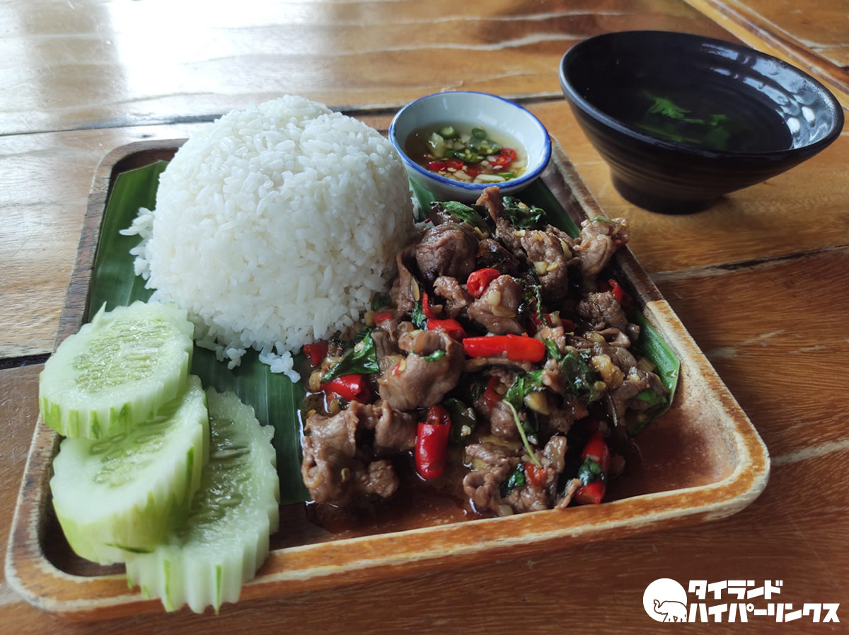 79バーツの牛肉のガパオライスです。見た目も美しく、肉の量もたっぷりで、味付けもよく、スープまで付いて大当たり!この店に入って良かった!